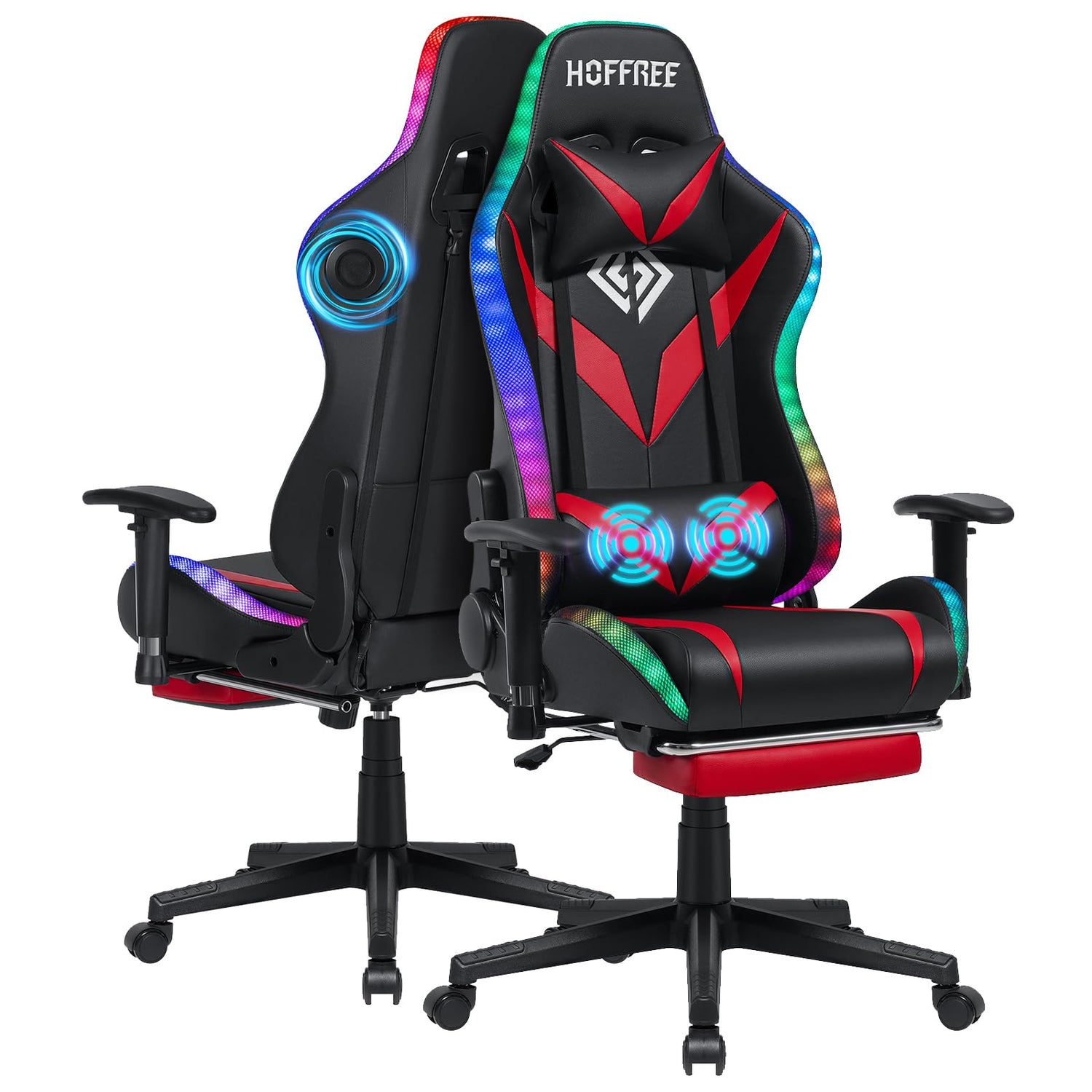 Gaming Chair with Bluetooth Speakers, LED Lights & Massage - Reclining with Footrest