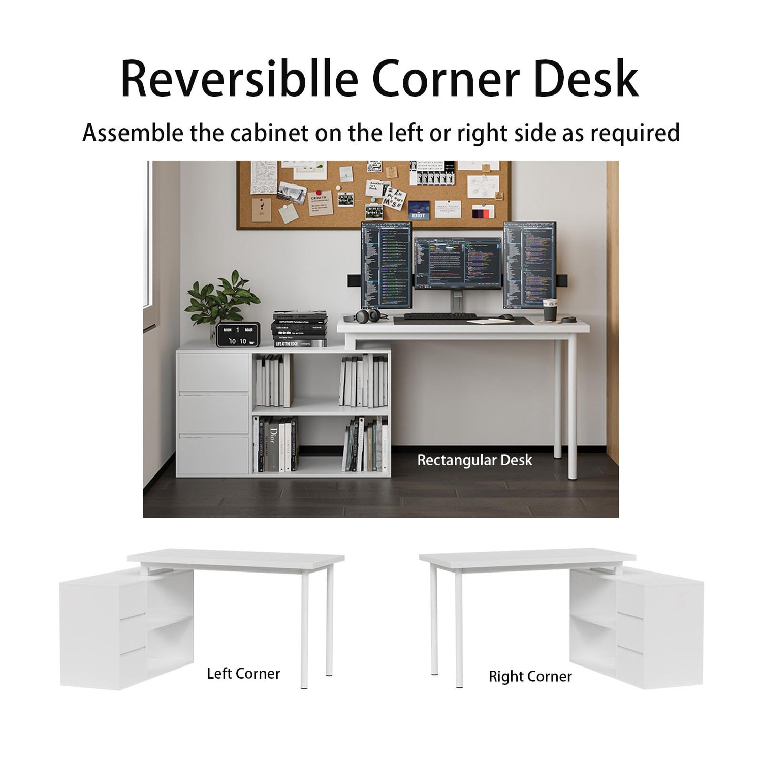 • Reversible Desk Reversible 47 inch small corner desk with drawers or 88 inch long office desk. This L-shaped desk is perfect for a corner, it can hold your computer, monitor, books, and files for the home office. An 88 inch two-person desk can hold two-person studying or writing no interference.
