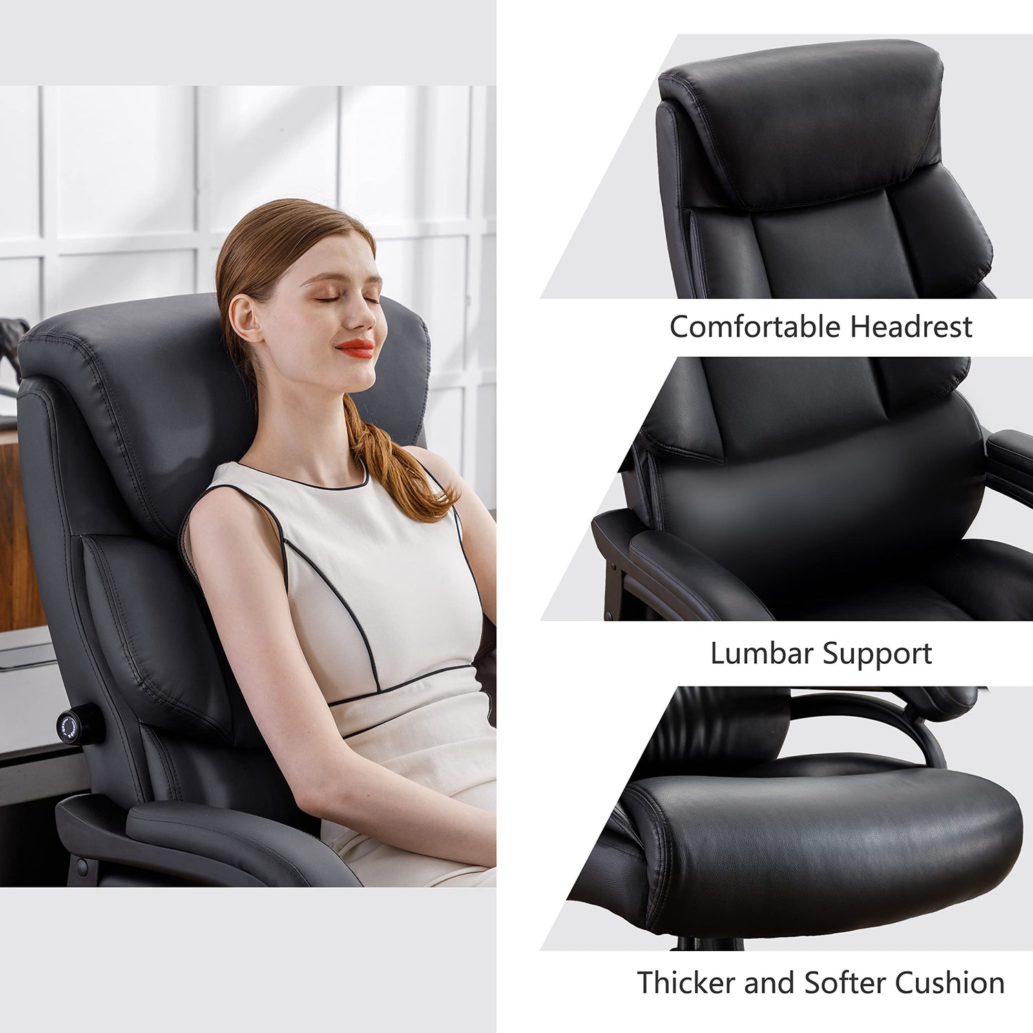 - The ergonomic design fits your back better, and the chair back is designed with soft cushions on both sides for a more comfortable wrap around your back. The high backrest allows you to rest against the office chair, and the soft headrest provides comfort for your head and neck.