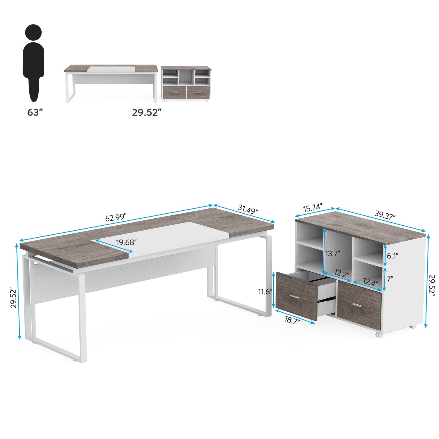 - Offering an expansive 63" desk and a 39.4" file cabinet, this set delivers ample storage options. Perfectly organize your essentials with the file cabinet's 2 drawers designed for letter-sized files and 5 open shelves to display your cherished items or decorative pieces.