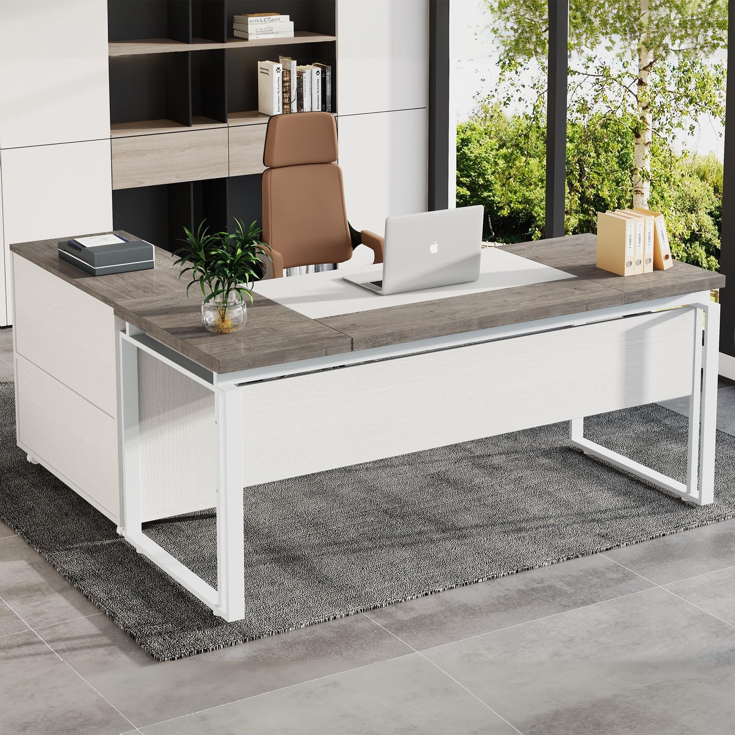 - Elevate your office space with the Boss Desk + File Cabinet Set. Its chic L-shaped design, adorned with a karo oak and white finish on the desktop and white iron frame, harmoniously blends with the fishbone pattern on the filing cabinet door, radiating sophisticated modernity.