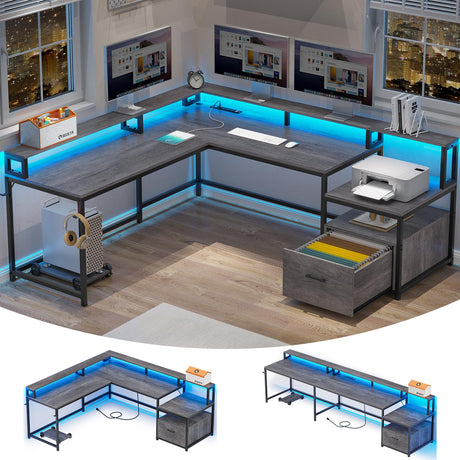 L Shaped Office Desk, 66" Home Office Desk with File Drawer & Power Outlet,