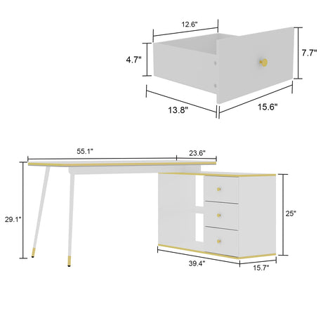 Home Office Computer Desk Corner Desk with 3 Drawers, 2 Open Shelves & Gold Lines