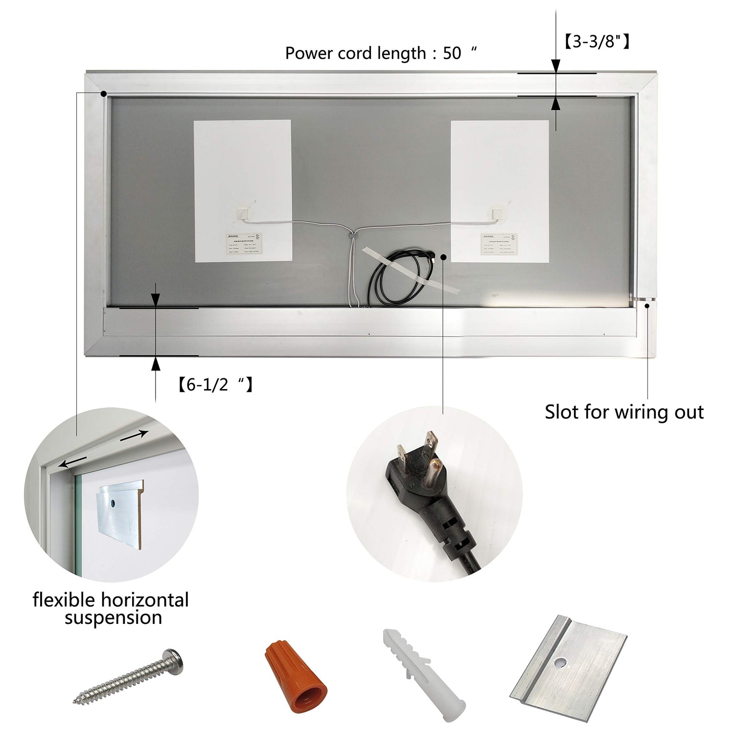 Details: COPPER FREE MIRROR Copper Free Mirror with polished Edge for finger protected.5mm thickness for higher stability. 3 times durable to conventional mirrors. High humidity locations applicable. Color Rendering Index (CRI) CRI is a quantitative measure of the ability of a light source to reveal the colors of various objects faithfully in comparison with an ideal or natural light source. B&C "L" &“Apollo” Series Mirrors only use lights with a CRI of 95 or higher. They are better than last generation at color rendering. BACKLIT: Double luninance than last generation. Long lifetime(30,000 Hours). Saves up to 95% energy. DEFOGGER: Innovative Defogger Pad(UL listed) applied. TOUCH SWITCHES: ON/OFF, DIMMER & COLOR TEMPERATURE with MEMORY OF LATEST CONFIGURATION. DEFORGGER Function can be turned off separately SAFETY: IP44 rated for safe use in bathrooms DATA Mirror Coating: 5mm Copper free Silver Mirror; Power Consumption: 64W; Power Cord Length: 50"; Color Temperature Optional: 3000K, 4000K,6000K, and stepless; Dimmer:5%; 30%,;60%, 100% and stepless; Maximum Luminance:6528LM; Defogger Pad: 2; Highest Ambient Temperature for Operating: 45℃; Service Environment: Damp; After-sales service: 3 Years.