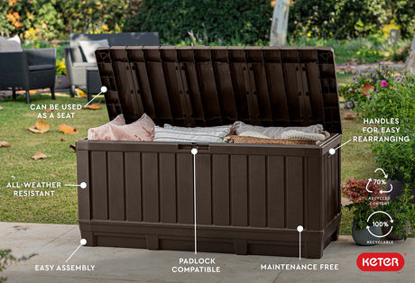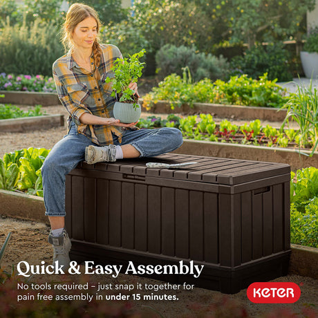 50-Gallon Outdoor Resin Patio Deck Storage Box with Seat, Peppercorn & Keter Marvel