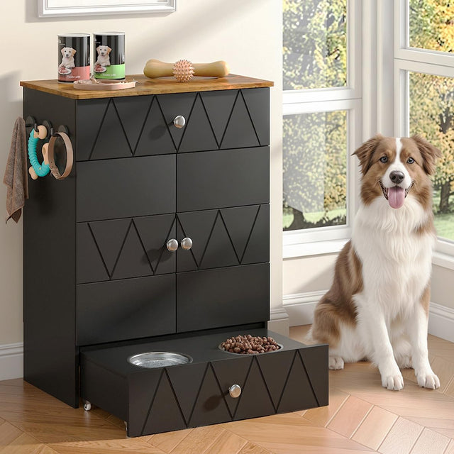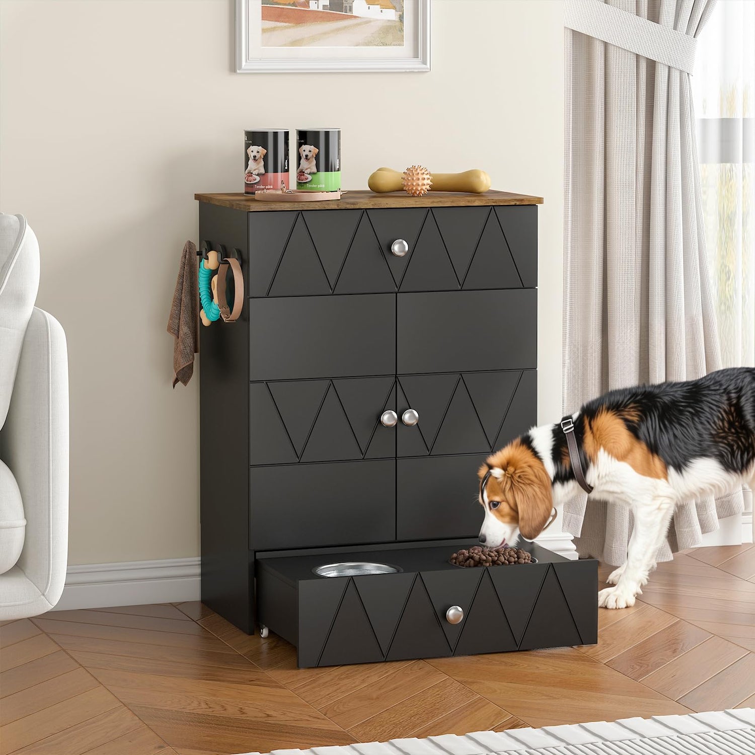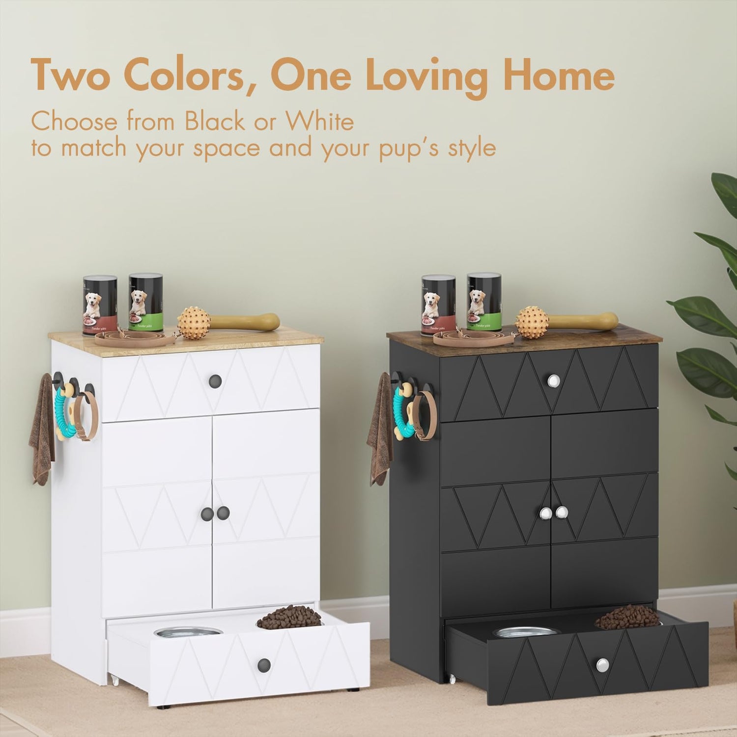 The versatile cabinet design includes adjustable shelves to accommodate items of various sizes, a smooth-rolling drawer for easy access to frequently used supplies, and convenient hooks for leashes, towels, or feeding accessories. The sleek black finish complements any home décor while providing a dedicated feeding zone that keeps your space tidy and organized.