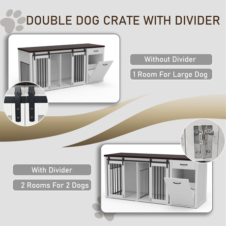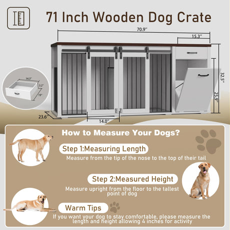 Double Dog Crate Furniture 71" Wide with 3 Drawers - Heavy Duty Wooden Kennel for 2 Large Dogs
