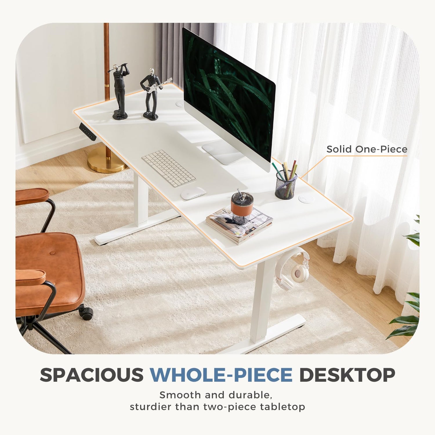 - Electric standing desk provides ample space to accommodate various monitors and laptops and work materials, supplies, or decorations.
