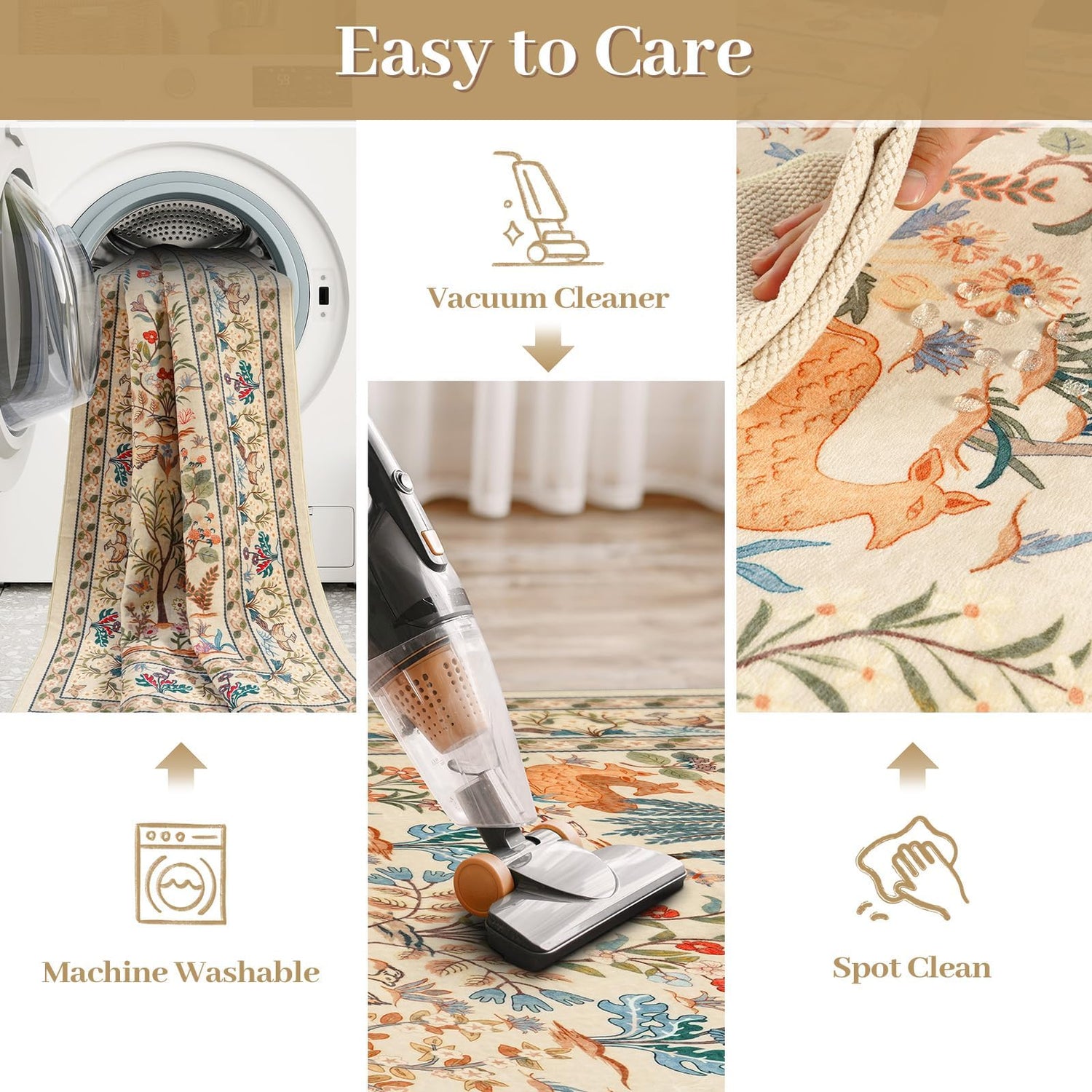 Transform your space with this charming 8x10 area rug featuring delightful woodland creatures and vibrant botanical motifs. Designed for modern living, this machine-washable rug combines style, comfort, and practicality.