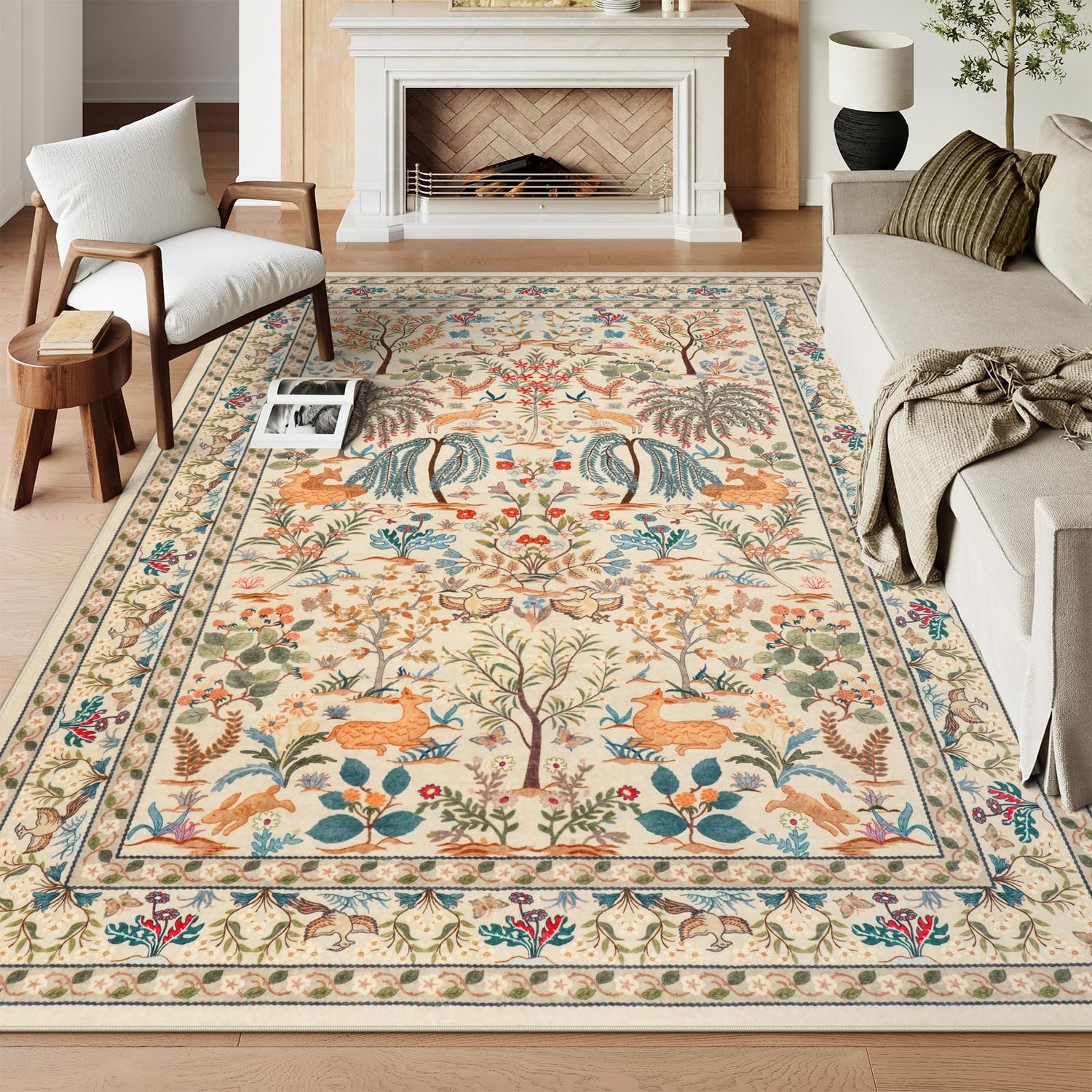 8x10 Washable Area Rug - Beige Botanical Print | Machine Washable & Non-Slip – Bircata