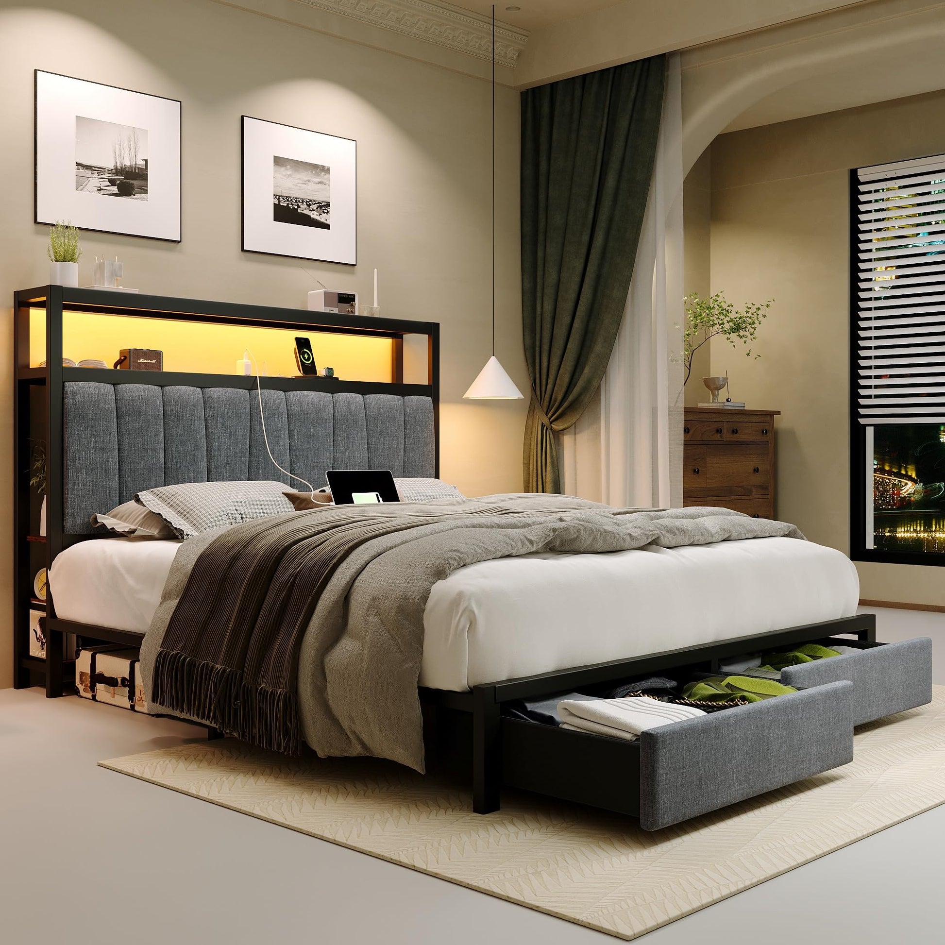 Fastroby LED Bed Frame Queen Size with Storage, Upholstered Queen Bed Frame with 2-Tier Charged Headboard and Drawers, 6-Side-Storage, Dark Grey
