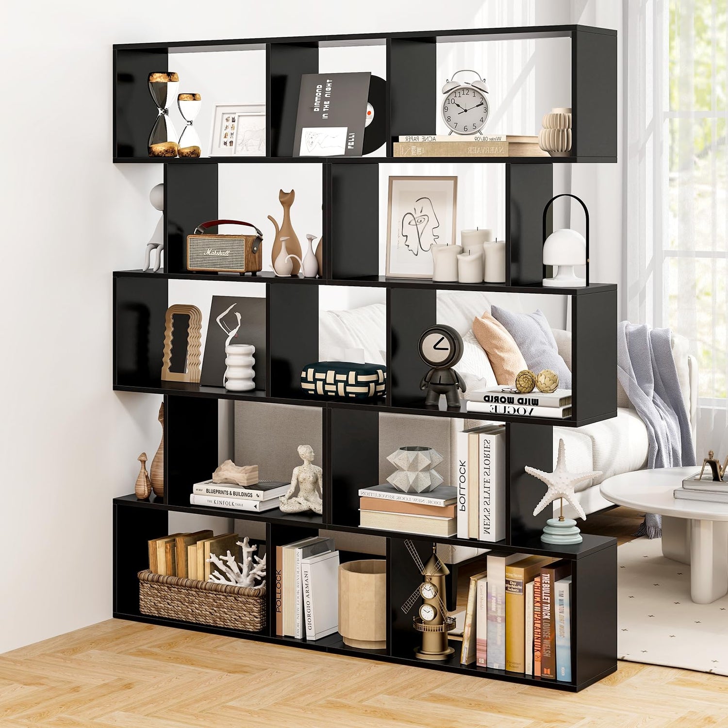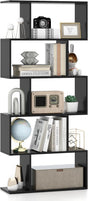 5-Tier Geometric Bookshelf Black, 62.5" Tall Wood S-Shaped Bookcase with Anti-Tipping Device, Floor Standing Display Shelf for Bedroom, Living Room, Study