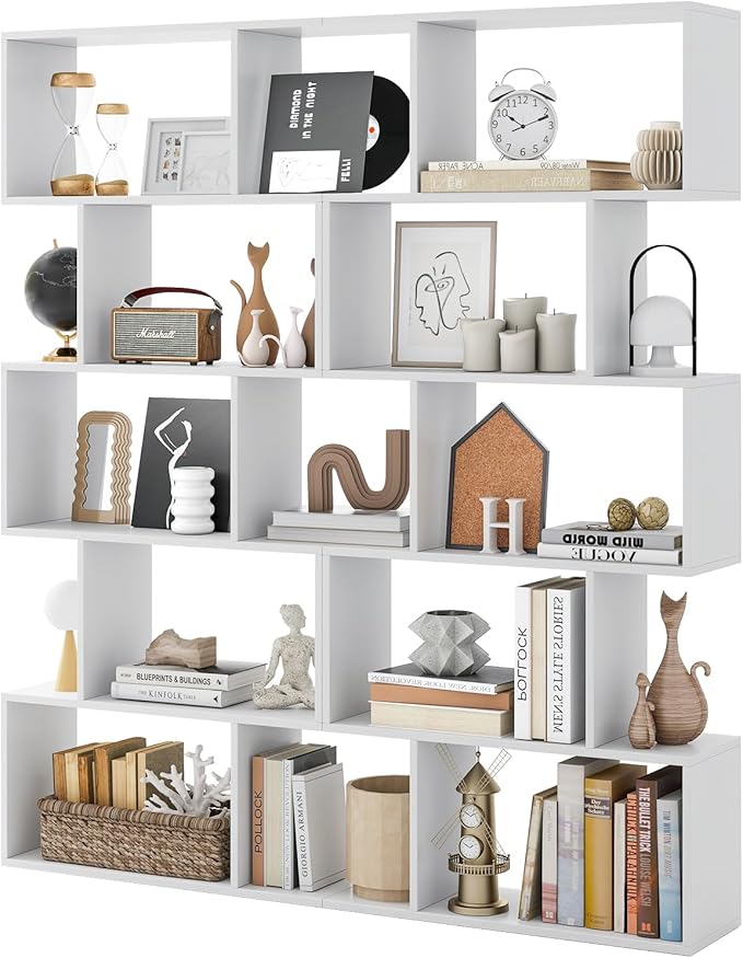 - Featuring staggered rectangular outline, the geometric bookcase catches people’s eyes at the first glance, and brings aesthetics to your home. Furthermore, it can be used as a room divider for different needs.