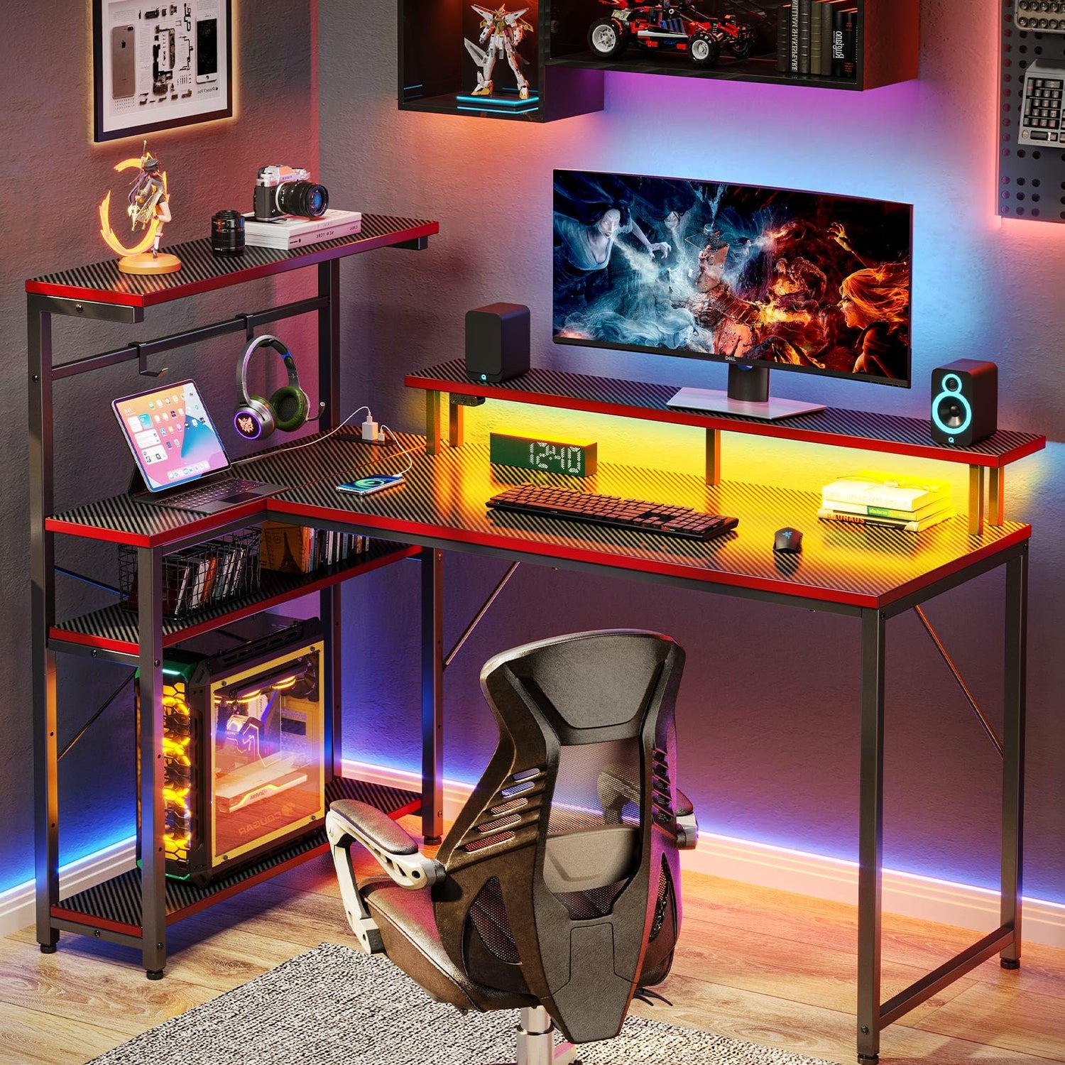 Seventable Gaming Desk with Power Outlet and LED Light, Reversible Small Desk with Monitor Stand, 4 Tiers Shelves and Hooks, 39" L Shaped Computer Desk for Living Room and Bedroom, Carbon Fiber Black