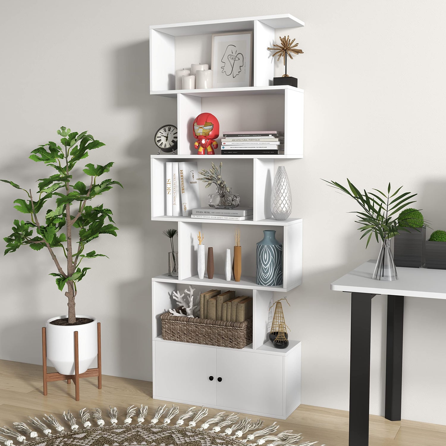 S Shaped Bookshelf with Cabinet, 6-Tier Bookcase with Doors, Freestanding Geometric Bookshelves for Living Room, Anti-toppling Device, Home Office Wood Storage Display Shelf (1, White)