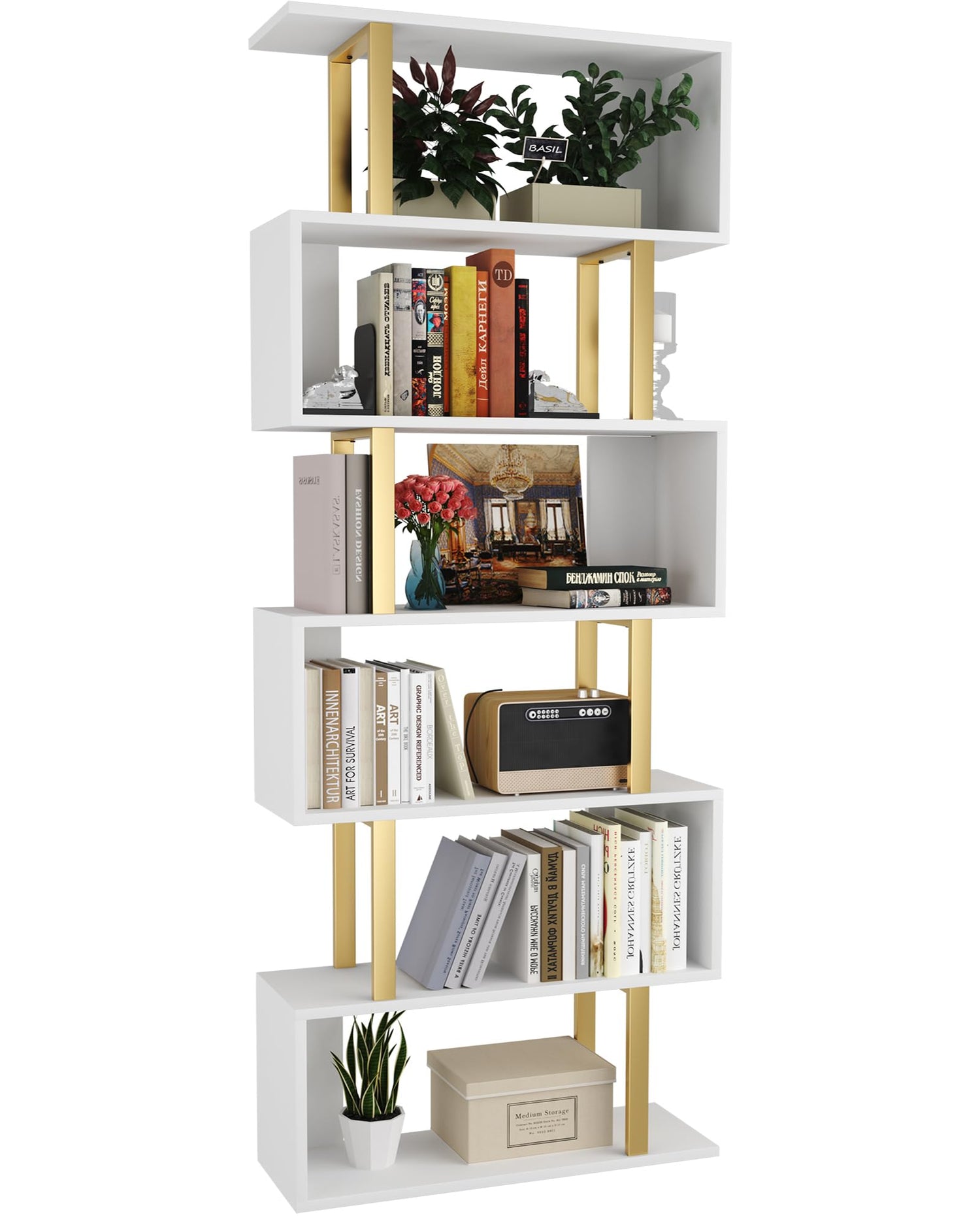 Geometric Bookcase, S Shaped Bookshelf 6-Tier Book Shelves for Bedroom, Modern Wood Decorative Display Shelf Tall Book Case for Home Office, Gold and White