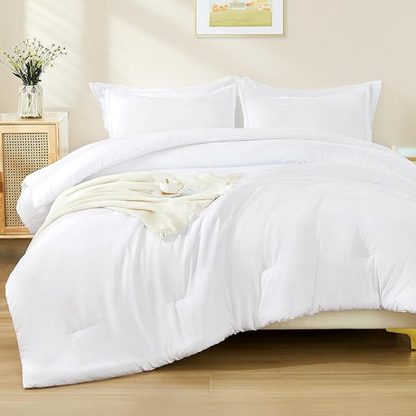 = White Comforter Set Queen Size, Lightweight Fluffy Farmhouse White Ruffle=