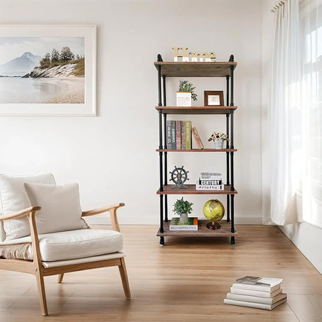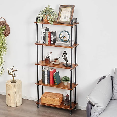 Industrial Bookshelves, Wood Pipe Bookshelf, 5 Shelf Rustic Display Storage Tall Standing