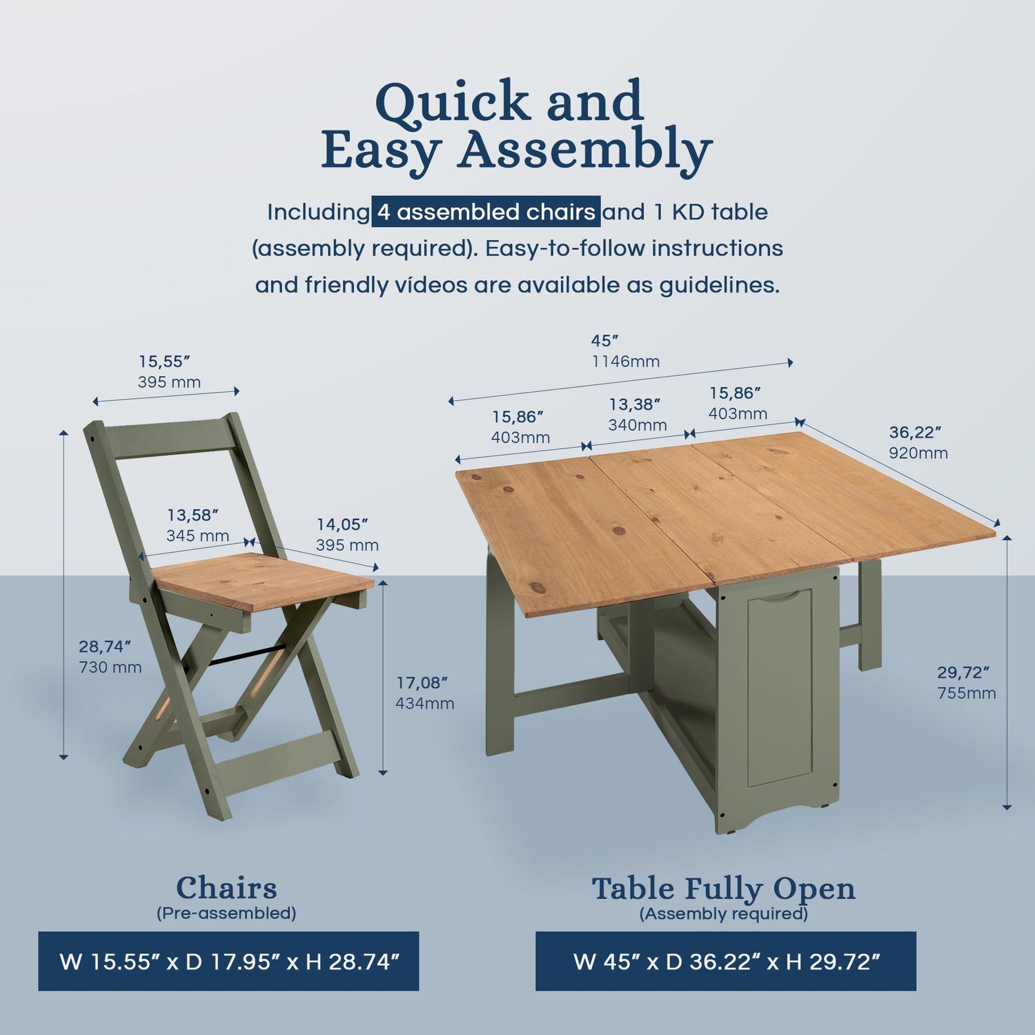 | Assembly | Chairs: Fully Assembled | Table: Minimal Assembly Required |