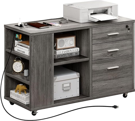 File Cabinet with Charging Station, Mobile Lateral Filing Cabinet with Lock