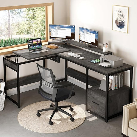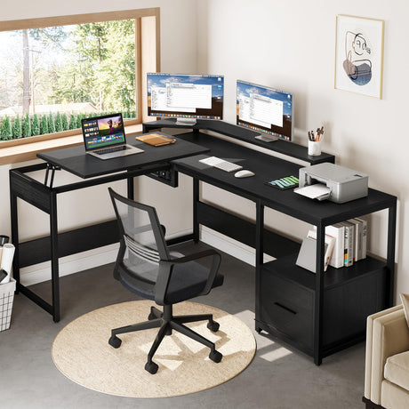 L Shaped Desk with File Drawer, 65" Large Computer Desk Corner Desk with Lift Top