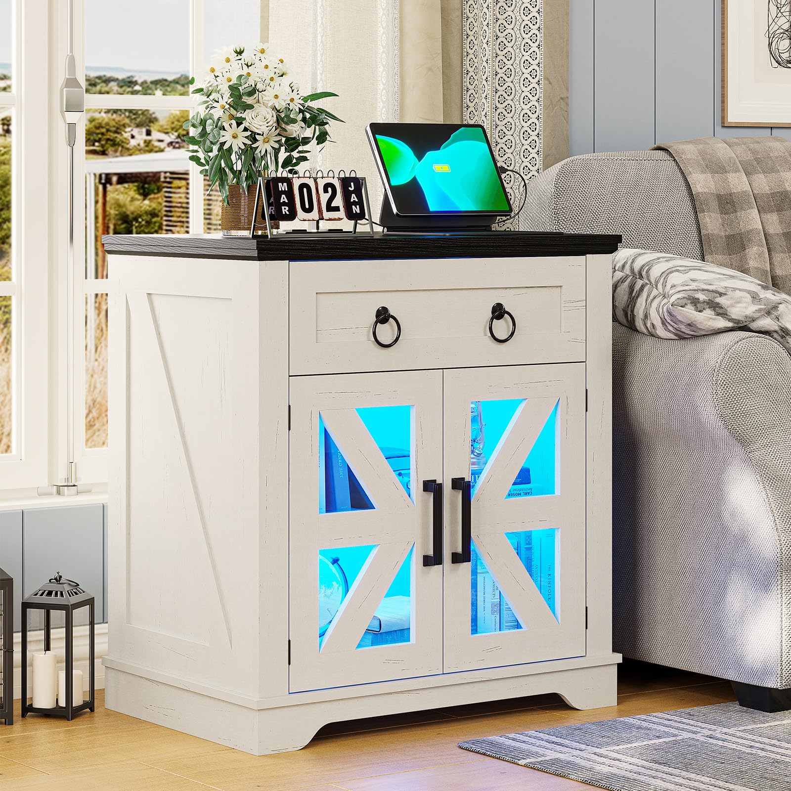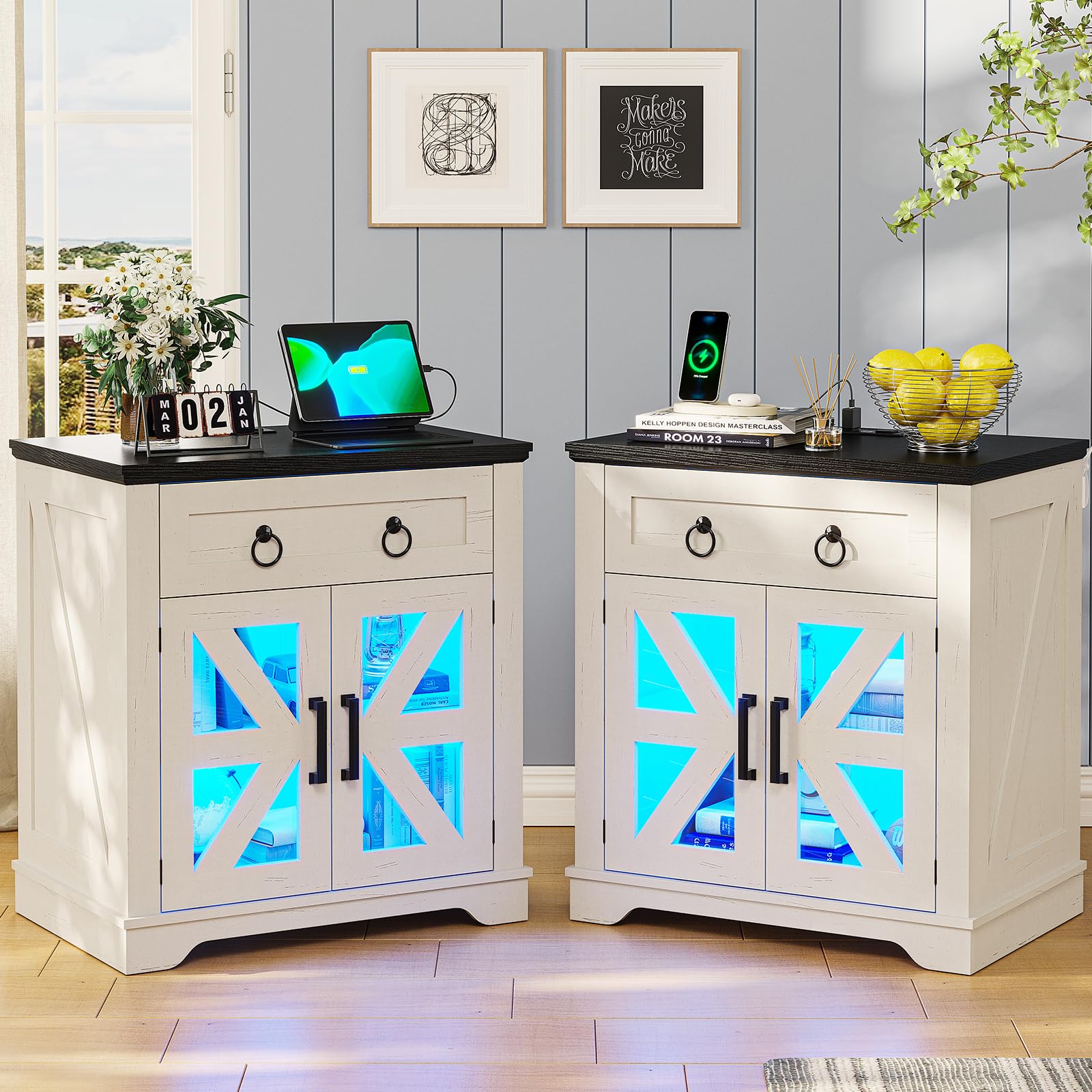 End Table Set 2 with LED Lights, 23.6" Large Farmhouse End Table with Charging Station