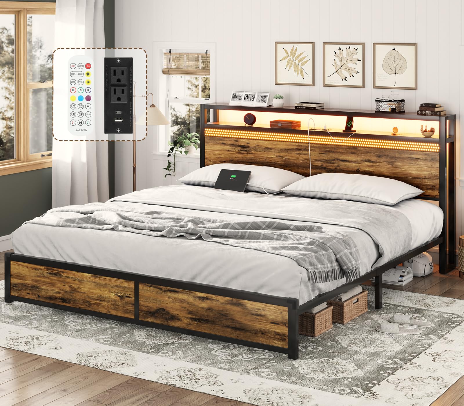 King Size Bed Frame, King bed frame with Storage Headboard with USB Ports & Charging