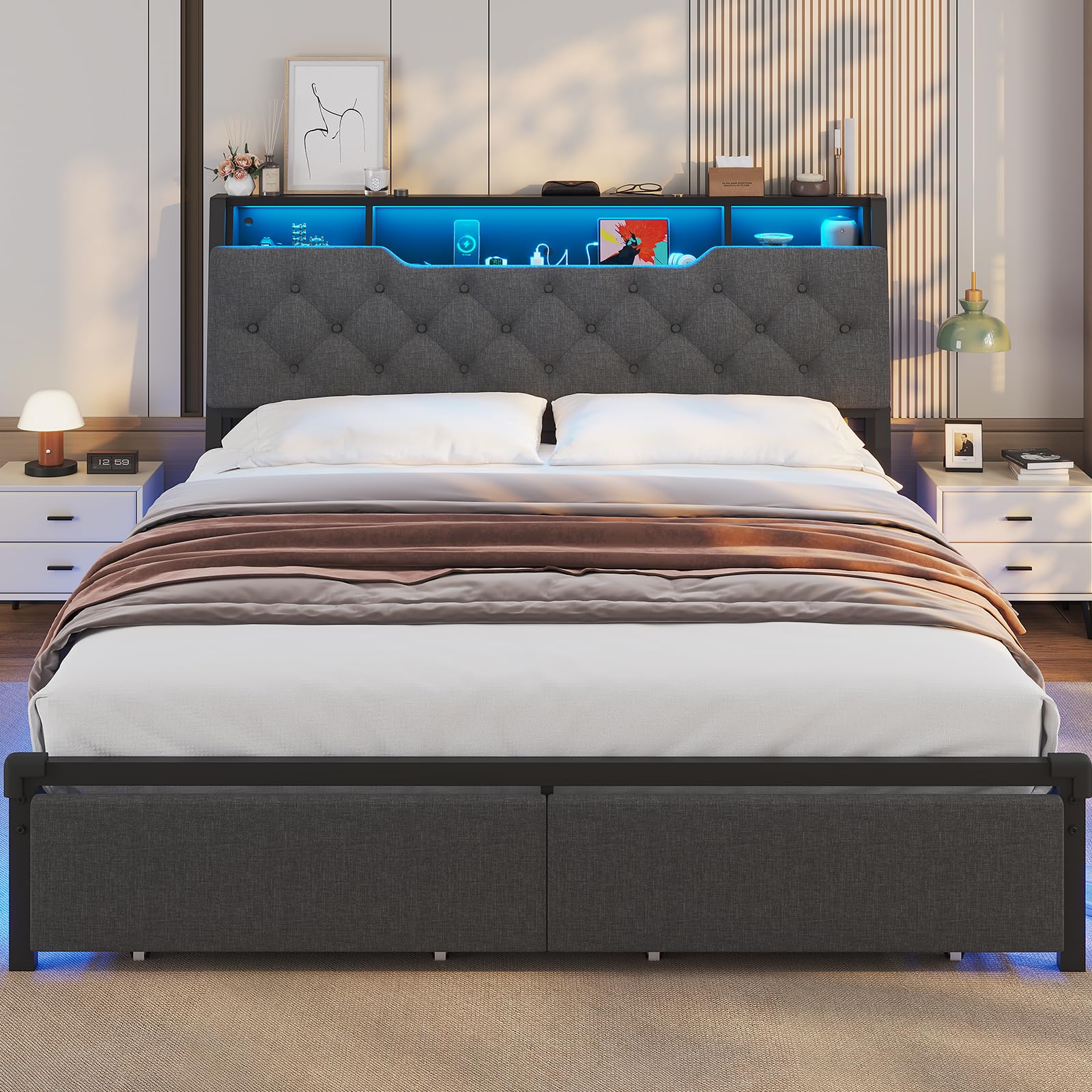 Queen Bed Frame with Charging Station, LED Bed Frame Queen Size