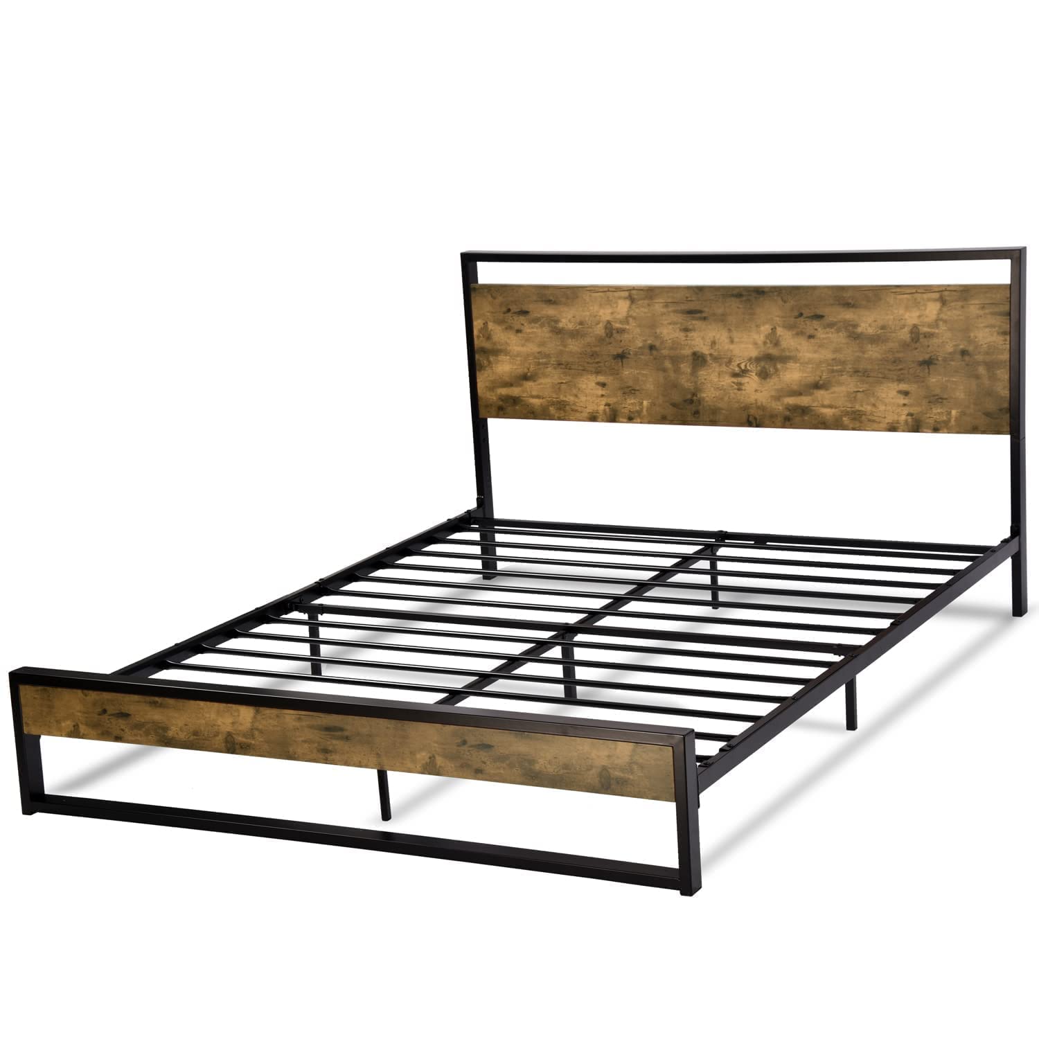 Full Bed Frame with Wood Headboard,Rustic Platform Bed with Heavy Duty Metal