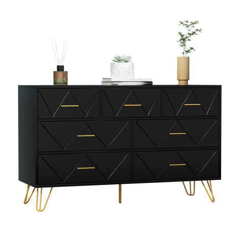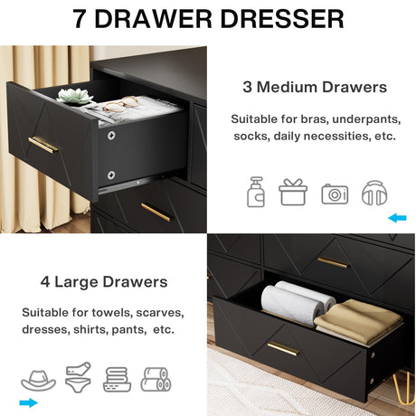 Dresser for Bedroom, 7 Drawer Dresser, Black Dresser with Gold Handles