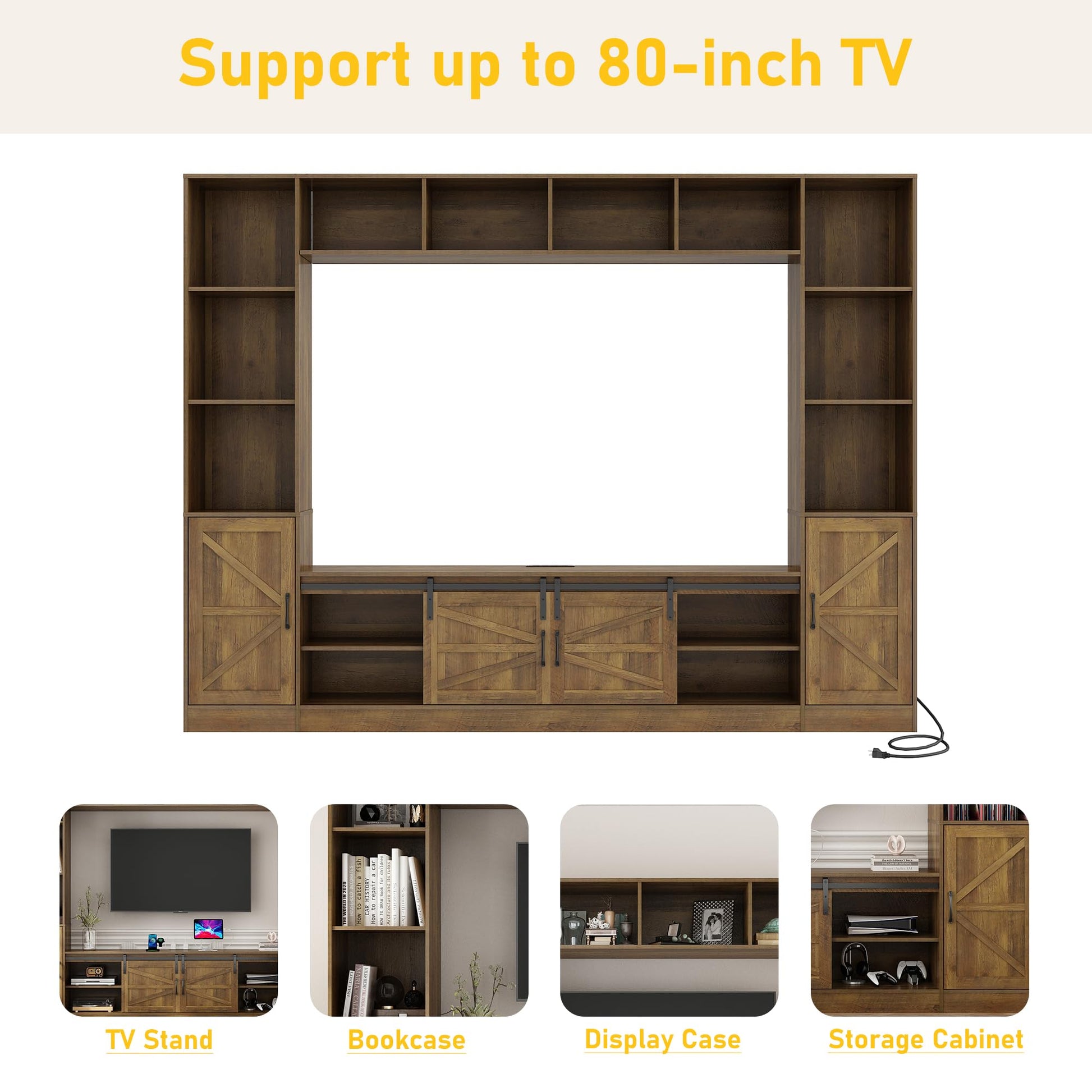 Transform your living space with this expansive 103-inch farmhouse wall unit entertainment center, designed to accommodate televisions up to 80 inches. This premium entertainment solution combines rustic charm with modern functionality, featuring sliding barn door cabinets and integrated power outlets for seamless media management.