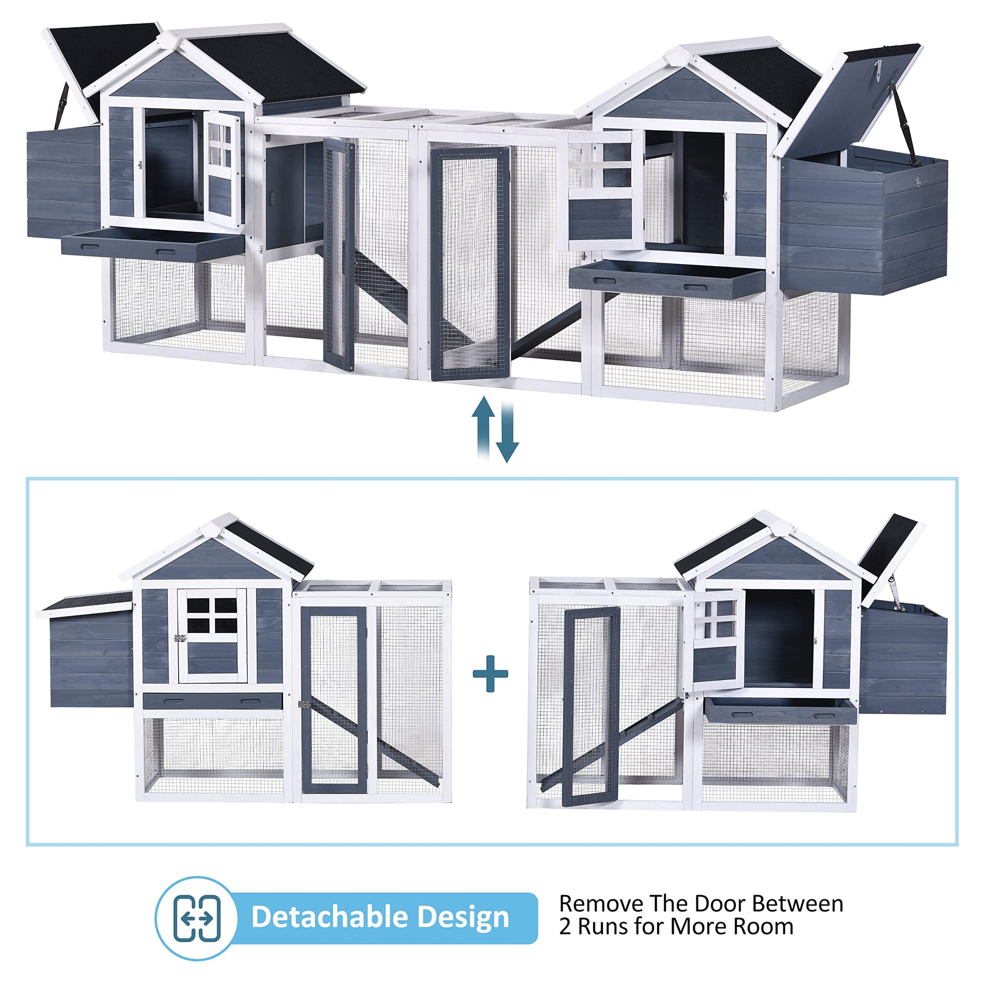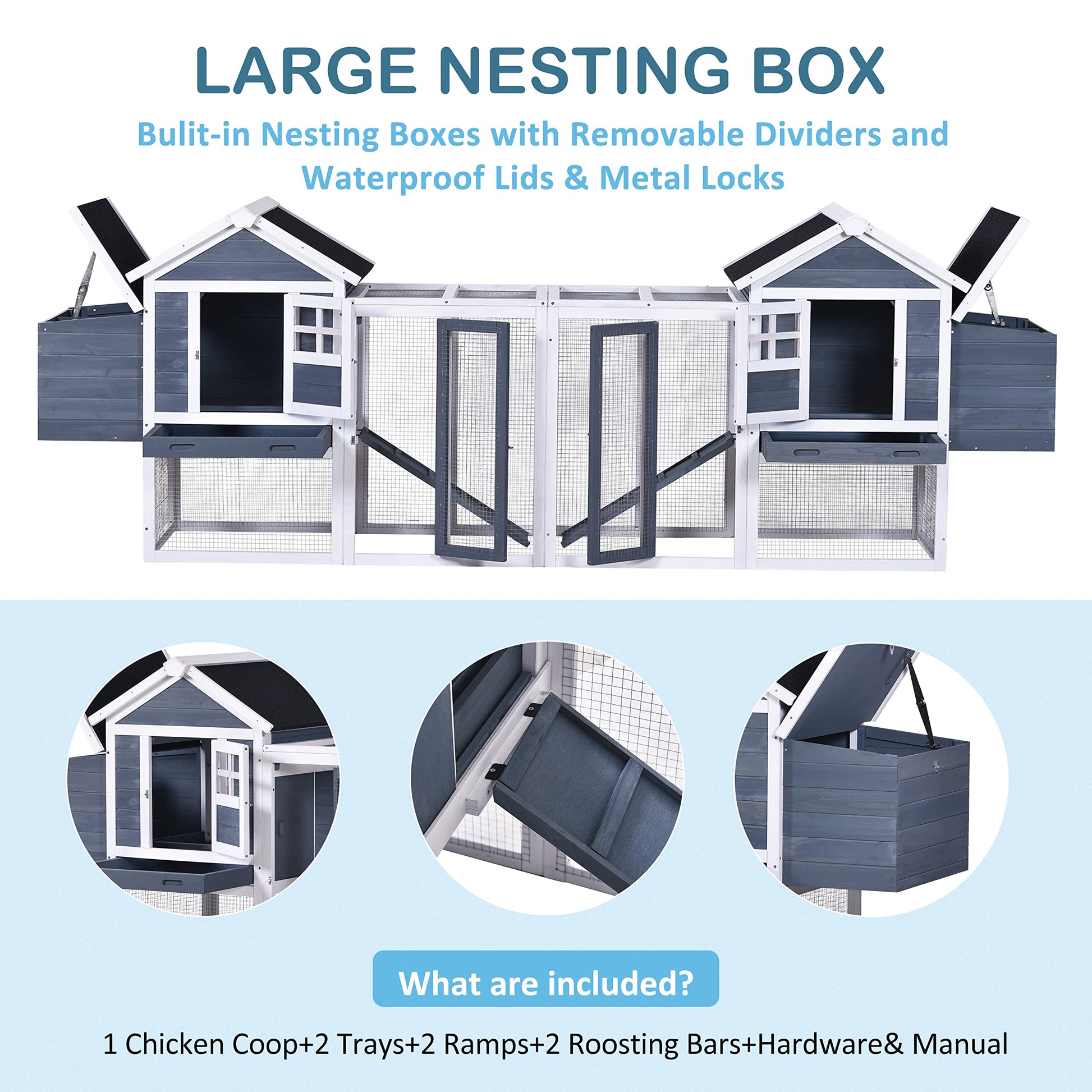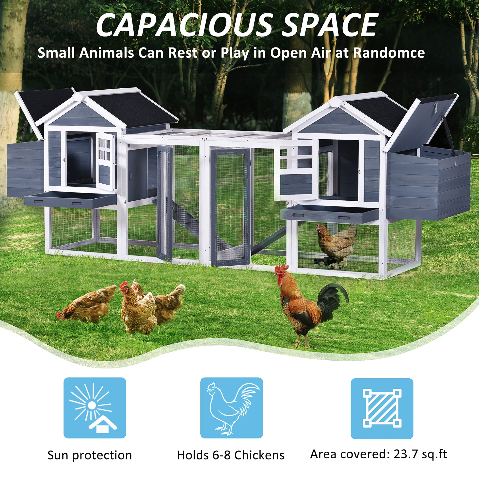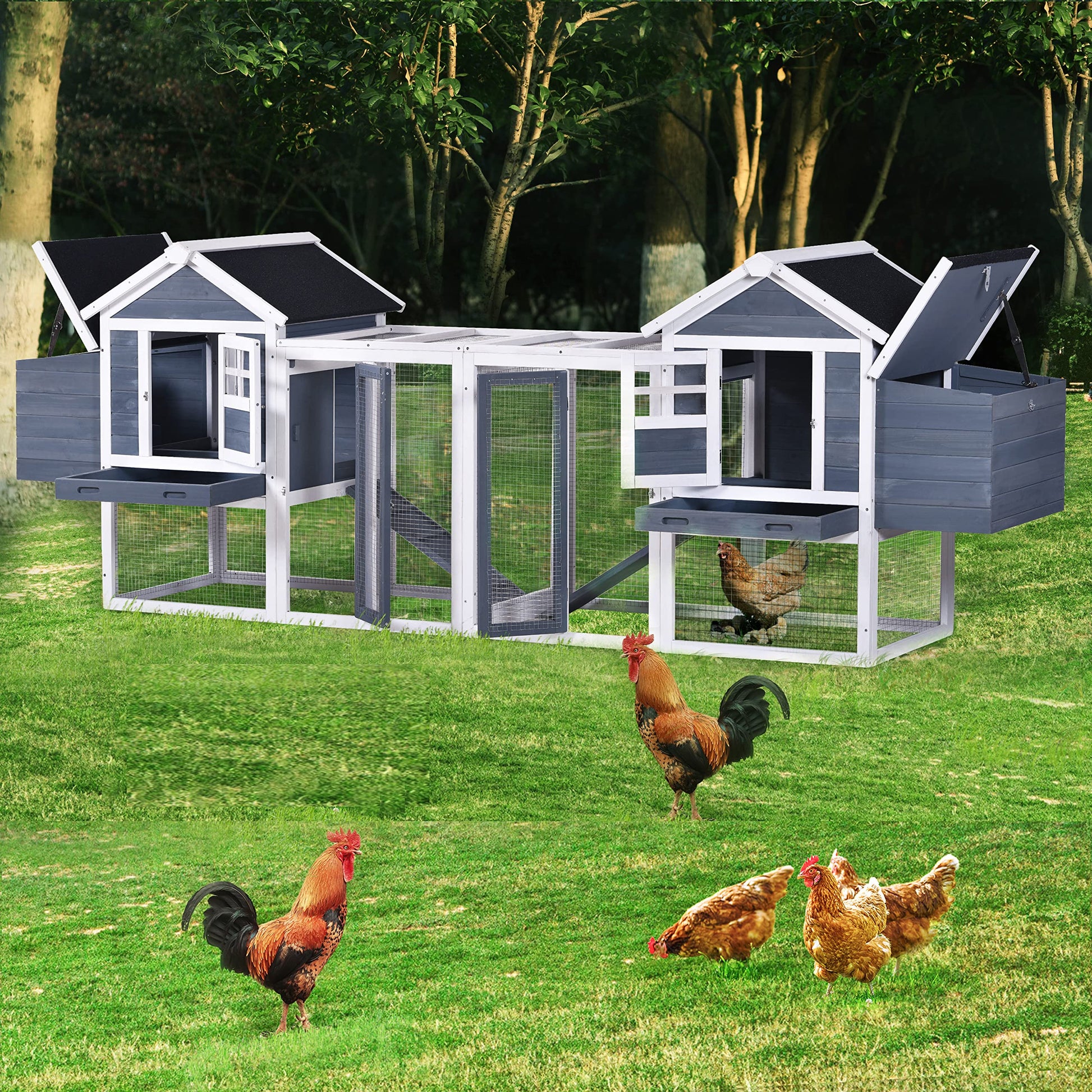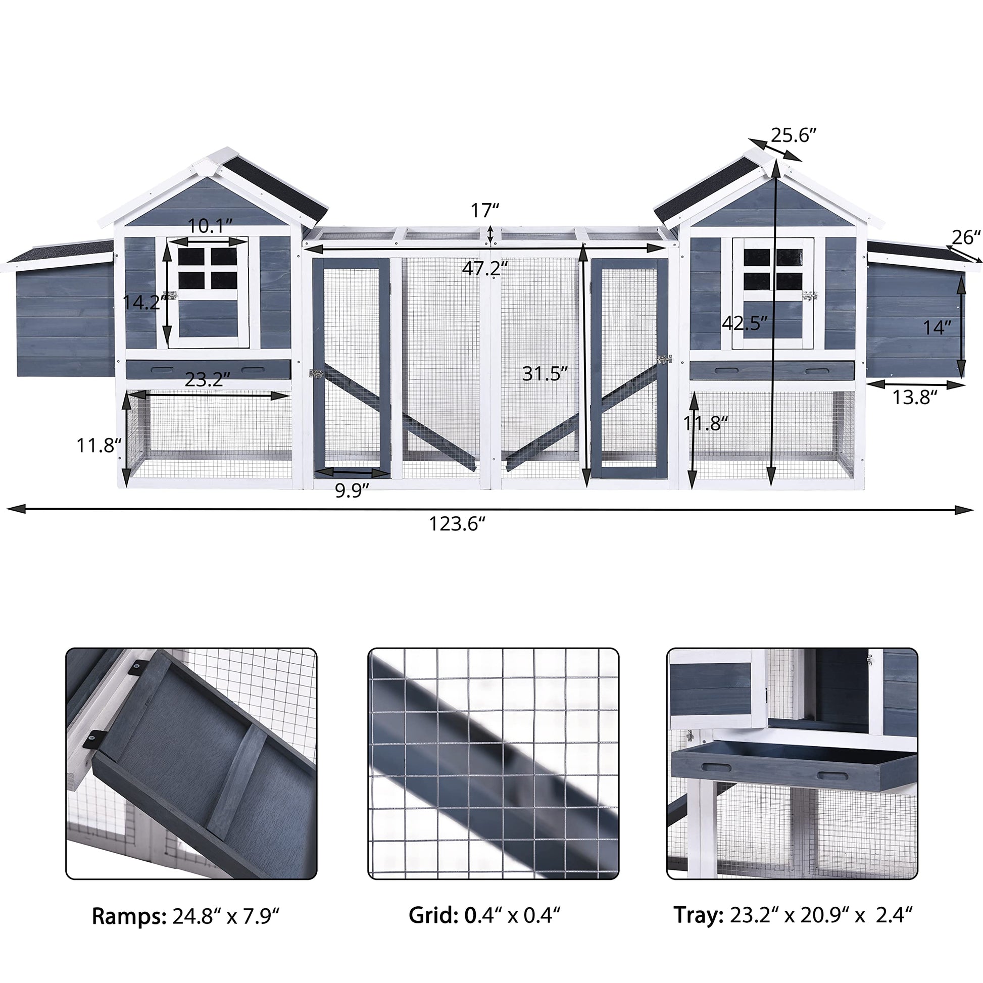 - Size: 123.6"L x 27.6" W x 42.7" H, this hen house can be used as duck coop or chicken coop,or is great for rabbits, guinea fowl, guinea pigs, squirrels or other small animals. Easy-access entry doors with slide bolts create a safe area to let your pets come in and out conveniently.