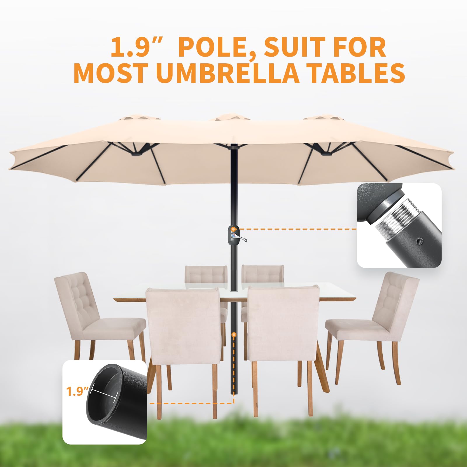 - Umbrella Dimensions - The overall size of this outdoor umbrella is: 15'L x 9'W x 7.8'H, it's large enough to cover a 6-person table, umbrella pole is 1.9", which is common in the market, fits most tables and bases