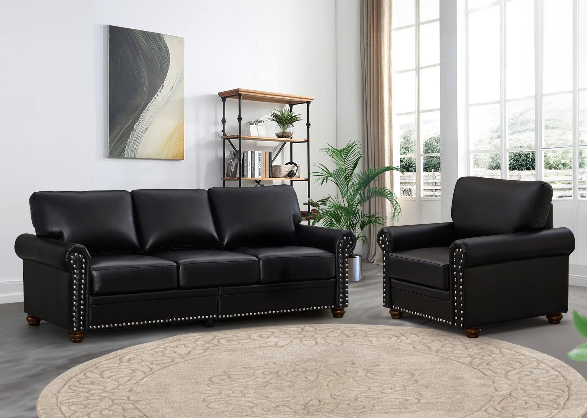 - The leather sofa has a simple and exquisite design, with a luxurious appearance. The hand-inlaid rivet head trim is elegant and eye-catching, and the classic roll armrests provide comfortable support. The couches for living room blends traditional vintage with modern chic, making it the perfect addition to living rooms, apartments, offices and other seating areas.
