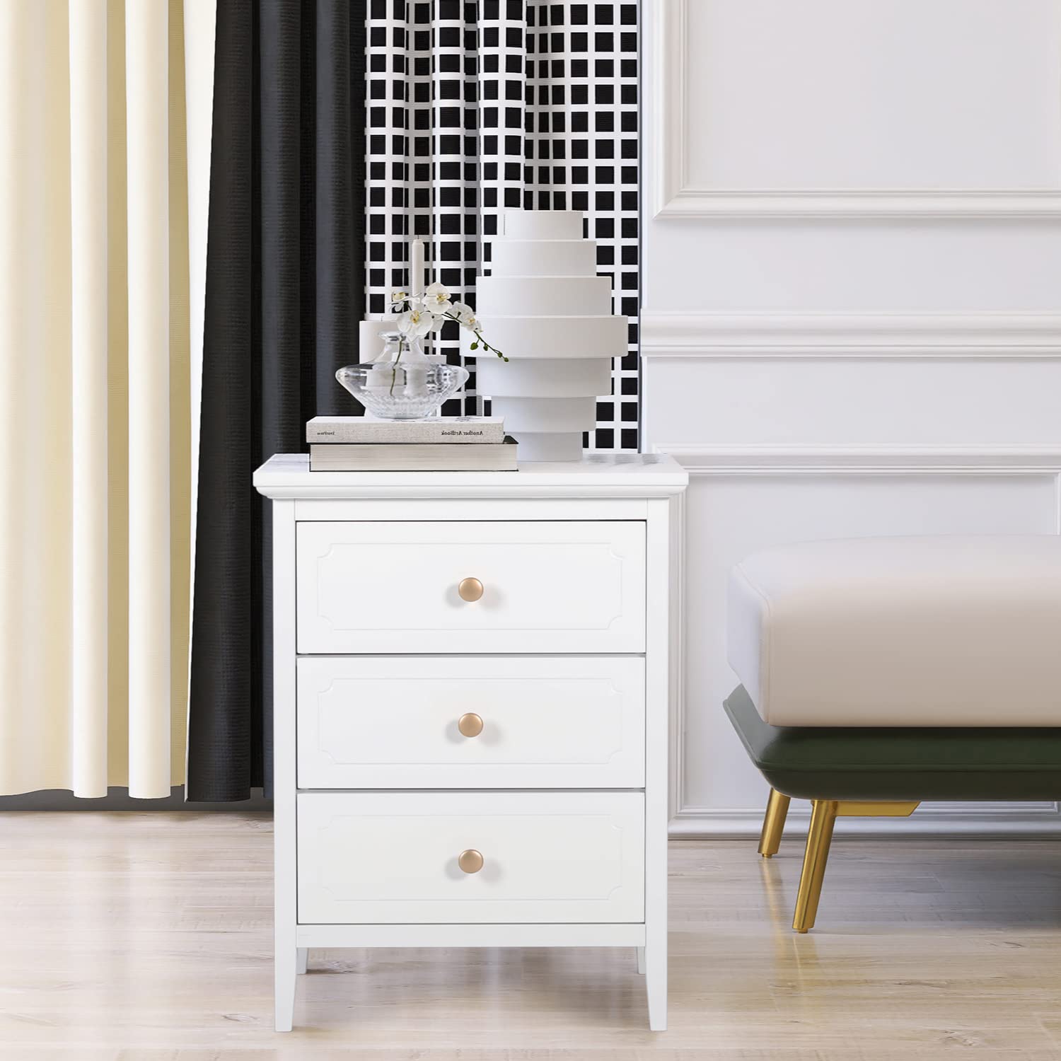 3 Drawer White Nightstand Wooden Large Night Stands with Gold Handle 19 Inch Modern