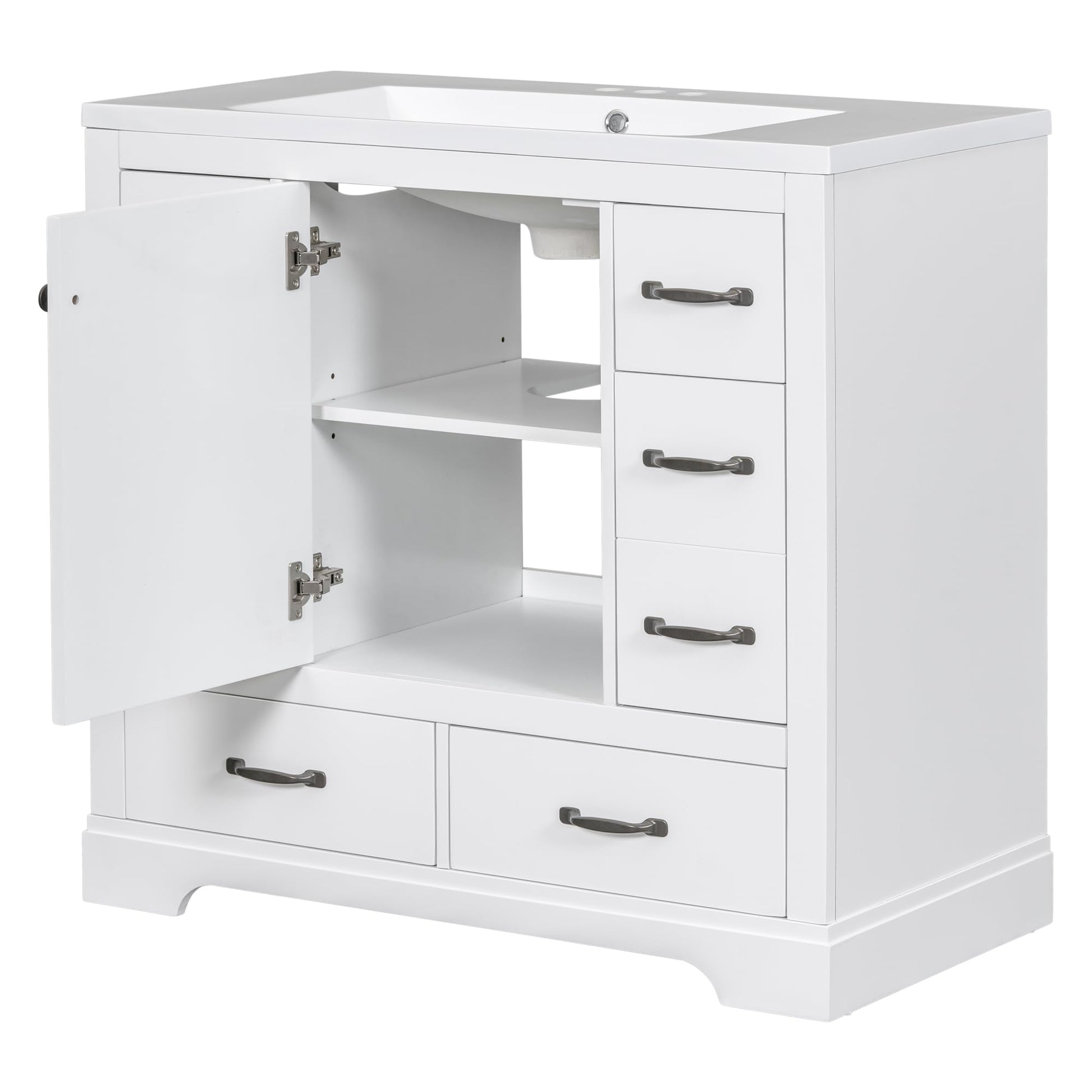 - This 36" bathroom vanity cabinet is suitable for a bathroom in any decoration style. The minimalist appearance enhances the overall aesthetic appeal of your bathroom. Additionally, one small drawer contains a multi-functional divider; while one middle drawer has two tiers of storage.