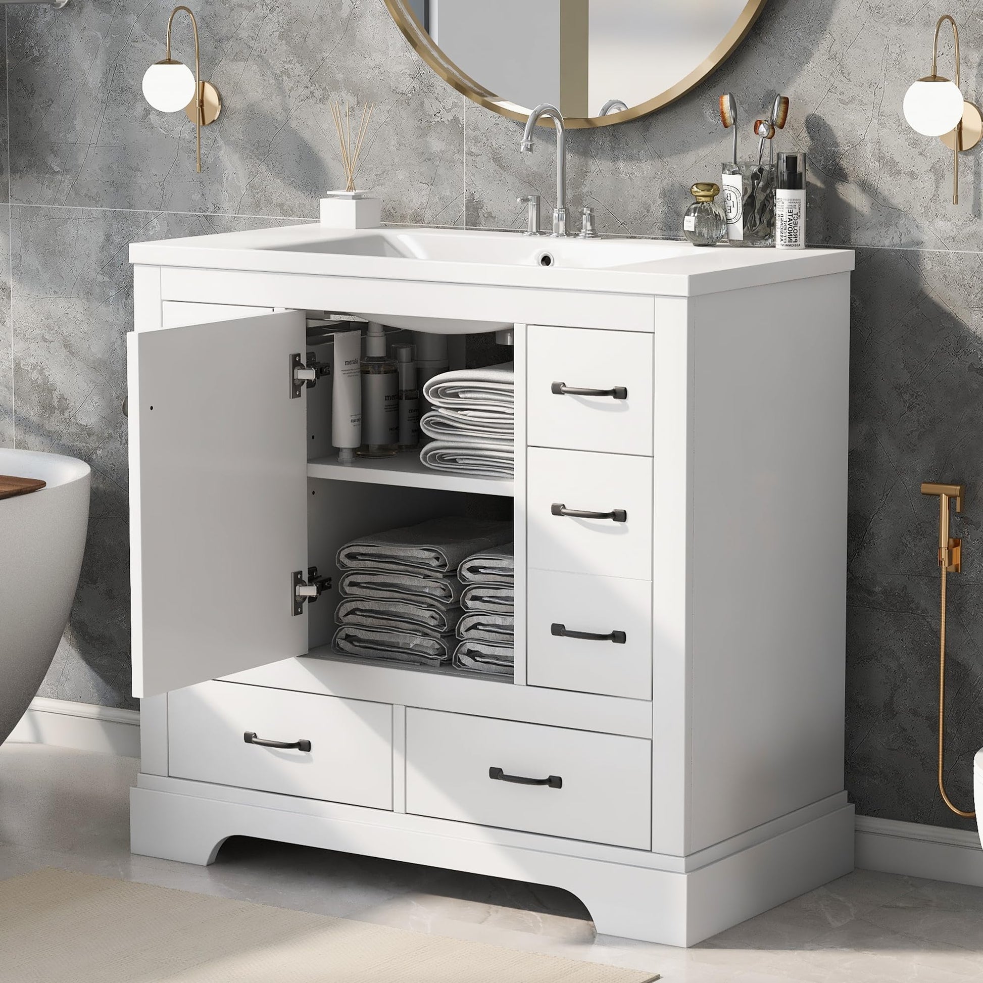 - This bathroom vanity has ample enclosed storage spaces: one cabinet with an adjustable shelf inside, and 6 drawers in different sizes with slide rails on each side. You can put soaps, towels, shampoos, tissue paper, and other bathroom essentials in it to keep them away from dust.