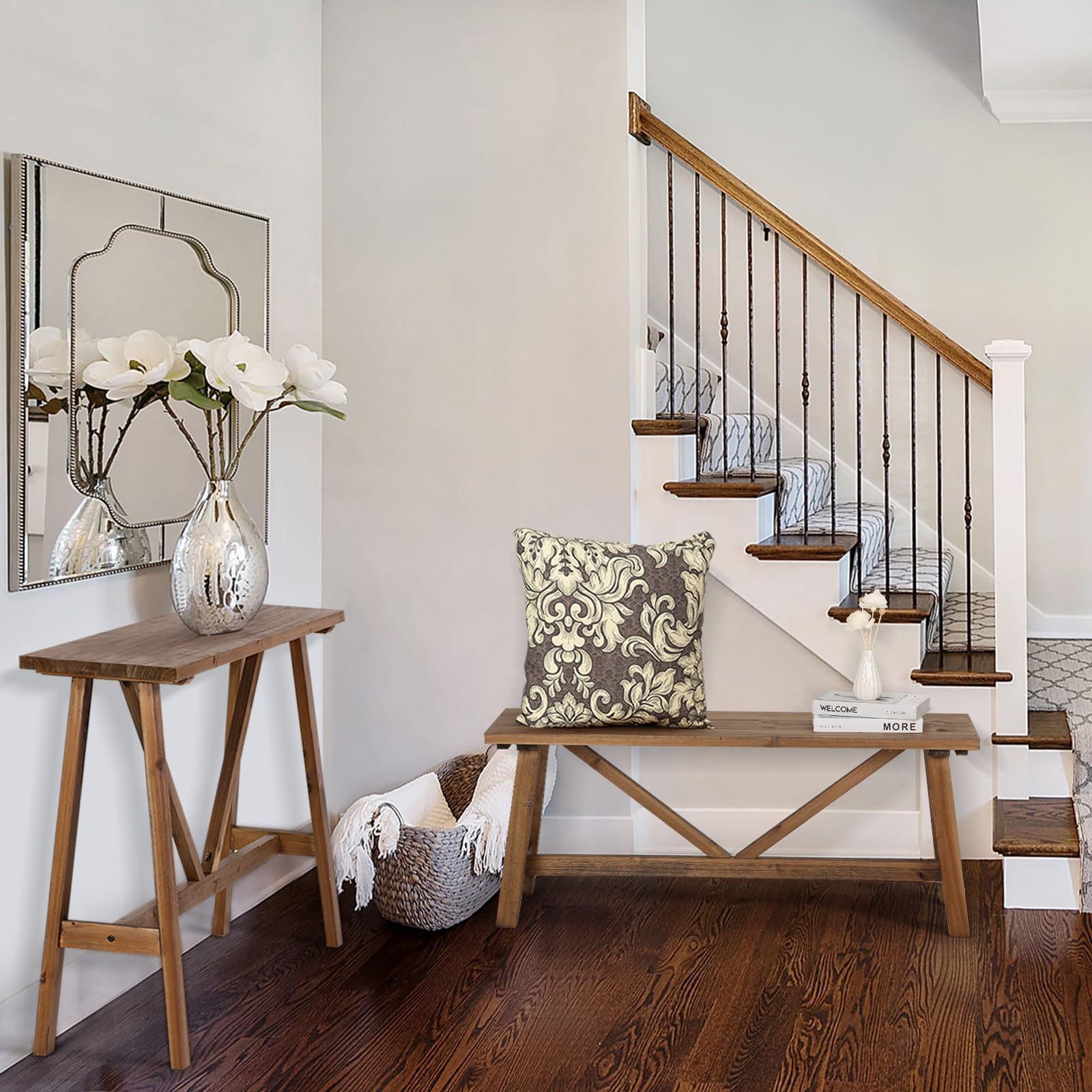 The natural wood grain and classic farmhouse styling bring authentic character to your home, while the sturdy construction ensures years of reliable use. Perfect for displaying décor, storing essentials, or creating a welcoming entryway statement.