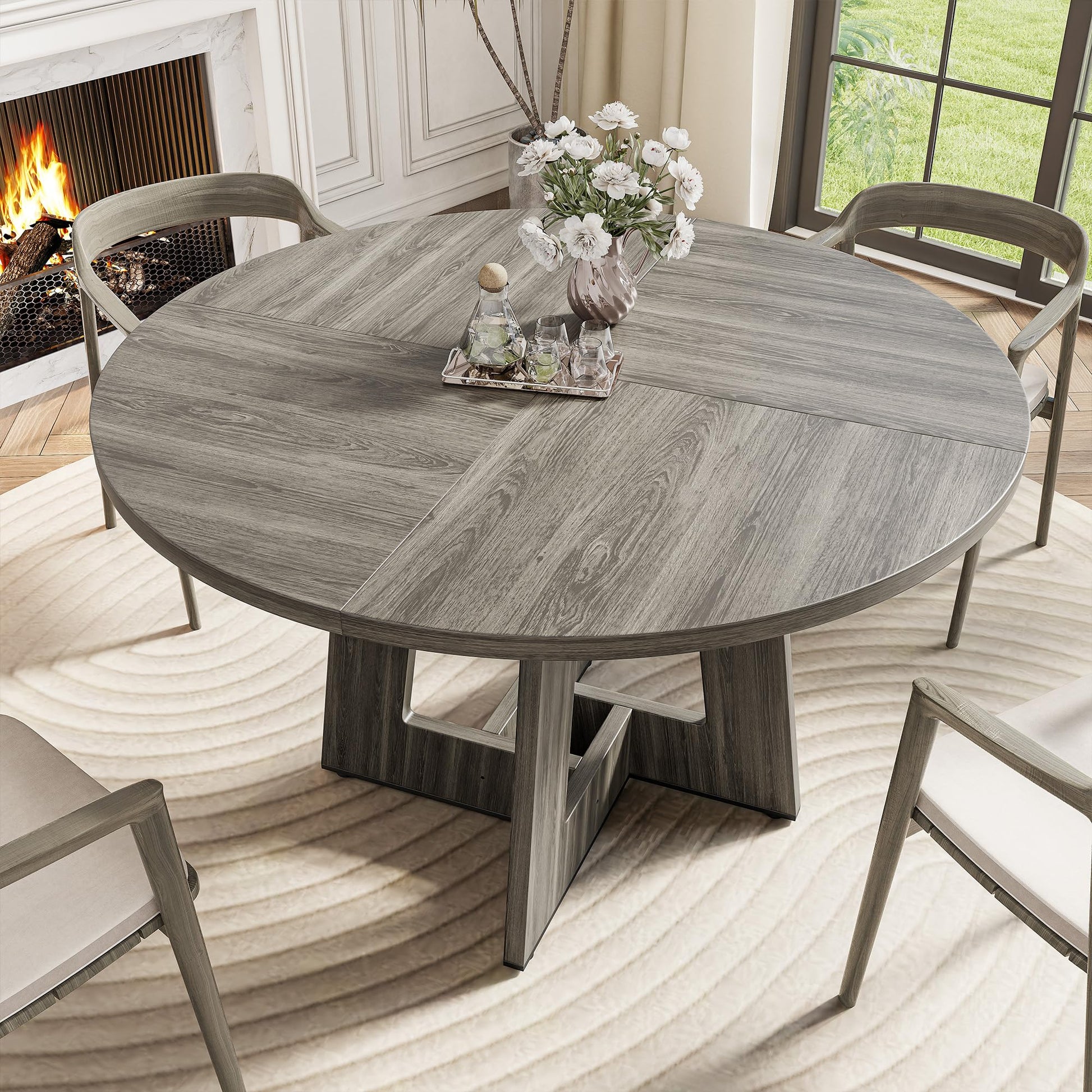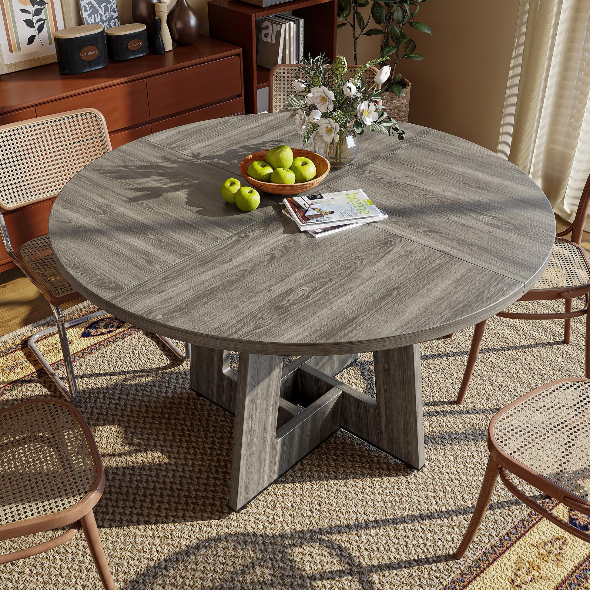 Elevate your dining space with this beautifully crafted 47-inch round dining table that comfortably seats four. Featuring a sturdy wooden pedestal base and farmhouse-inspired design, this versatile piece seamlessly blends style and functionality for your dining room, kitchen, or living area.