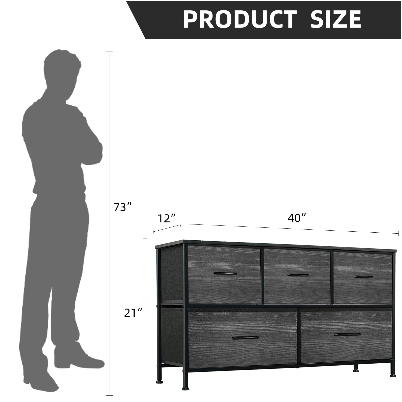 - Large Capacity Storage Chest Drawers Dimension: The fabric dresser measures 40" L x 12" W x 40" H. The storage tower comes with instructions and all hardware needed for installation, easy to assemble.