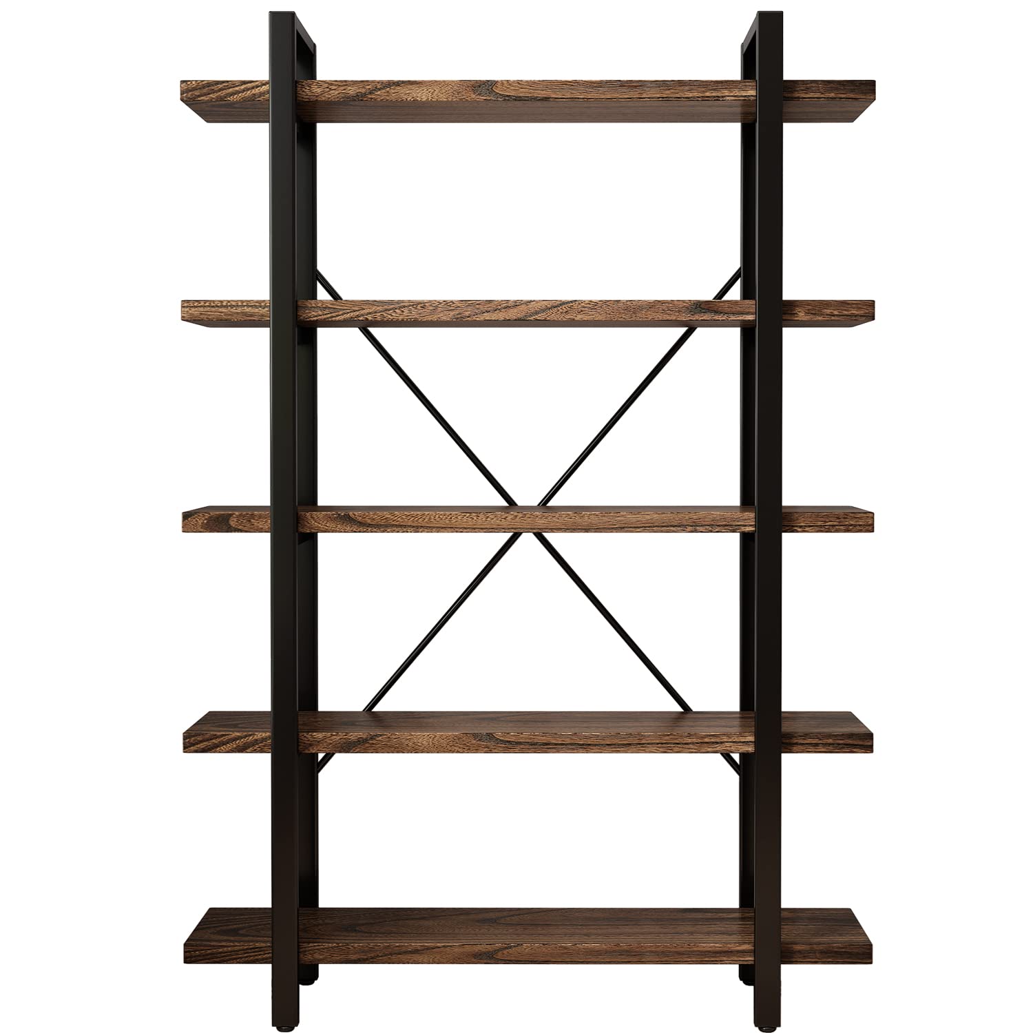 Industrial Style Solid Wood Bookcase and Book Shelves,Rustic Wood and Metal Shelving Unit, Living Room,Modern Rustic Open Industrial Book Shelf Office,Distressed Brown (AY-02-5Tier)
