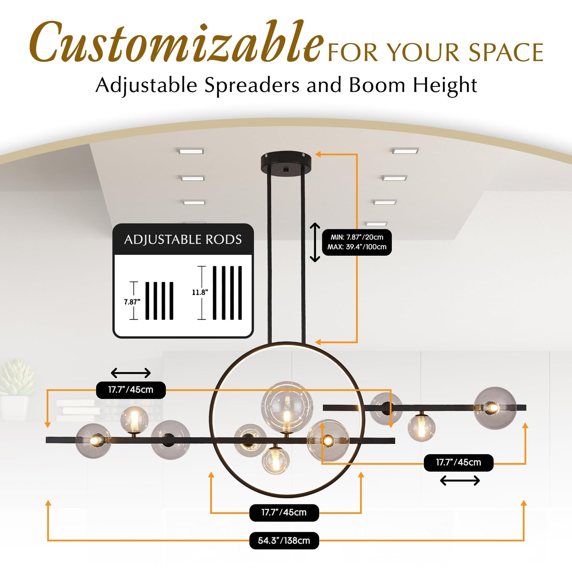 54" Kitchen Island Lighting,10-Light Chandelier with Glass Globe Shade,Black LED Dining