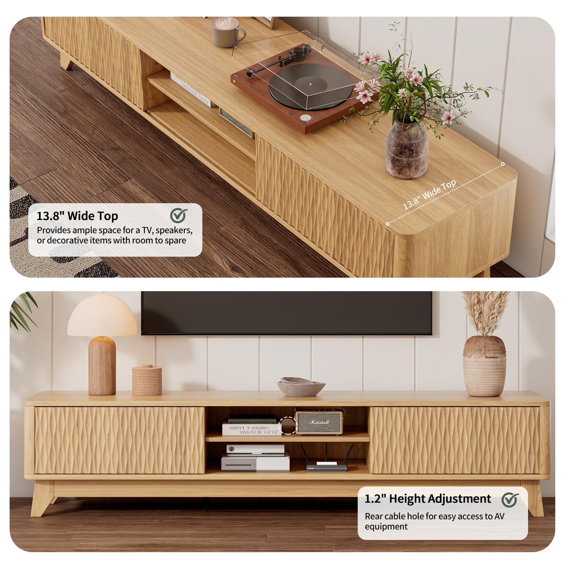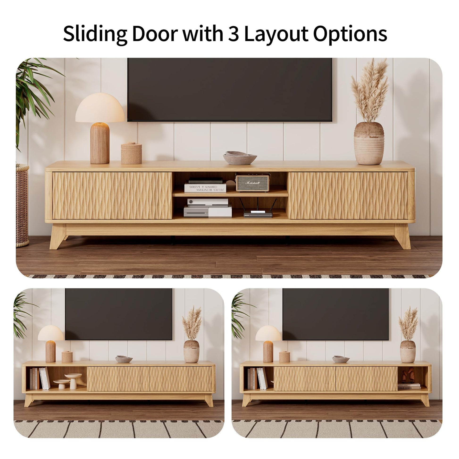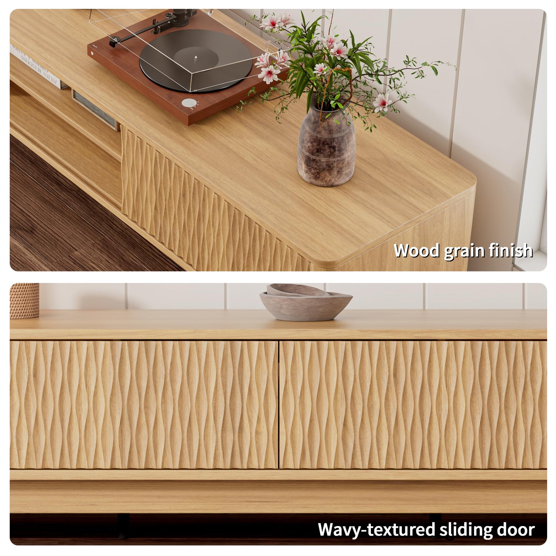 Elevate your living space with this sophisticated mid-century modern entertainment center, designed to accommodate 55", 60", or 65" televisions. The distinctive fluted sliding doors and natural oak finish create a timeless aesthetic that complements any contemporary or transitional interior.