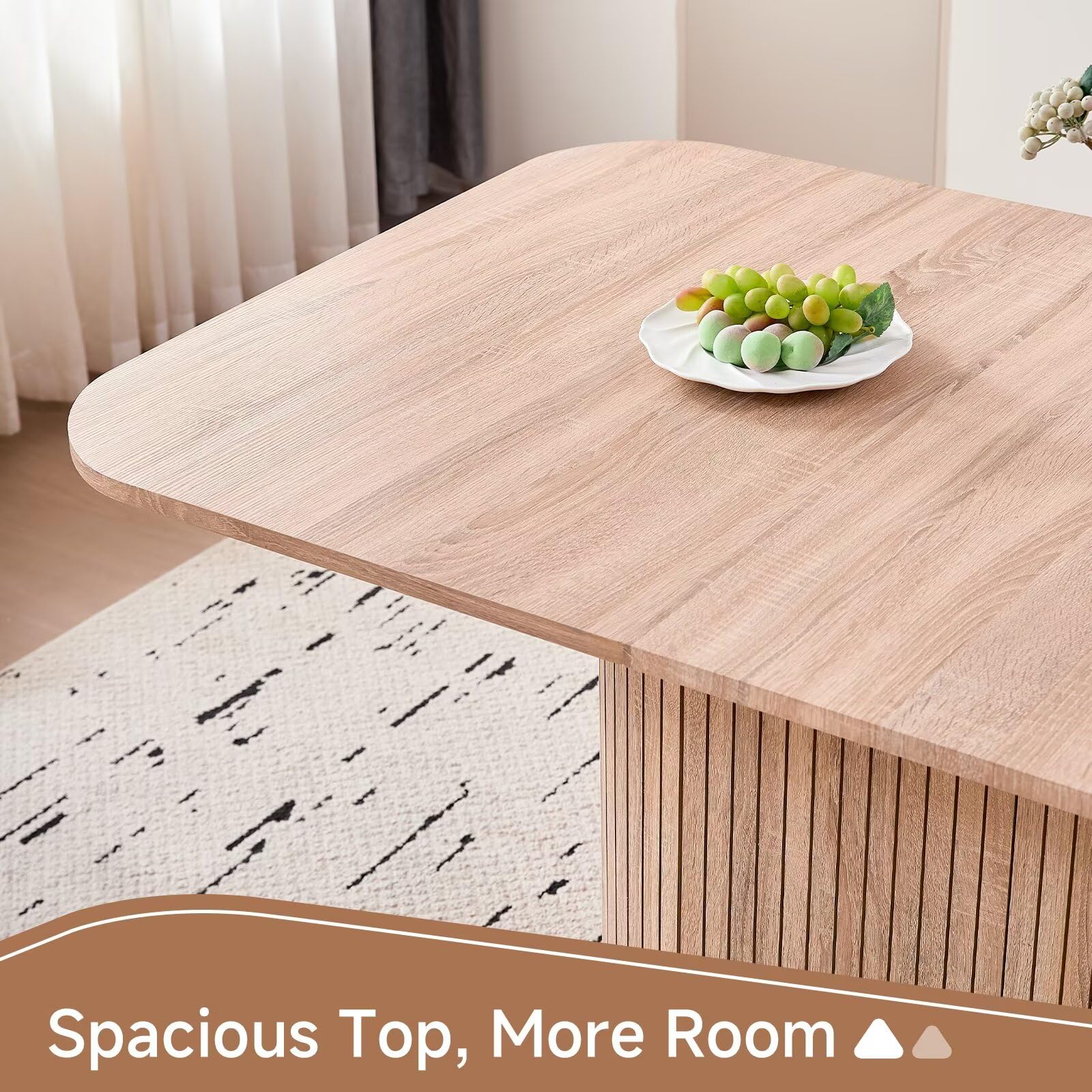 Elevate your dining space with this stunning 63-inch rectangular dining table that seamlessly blends farmhouse charm with modern sophistication. Designed to comfortably seat 4-6 people, this statement piece features thoughtful rounded corners for safety and style, complemented by an elegant wood strip pedestal base that provides exceptional stability and legroom.