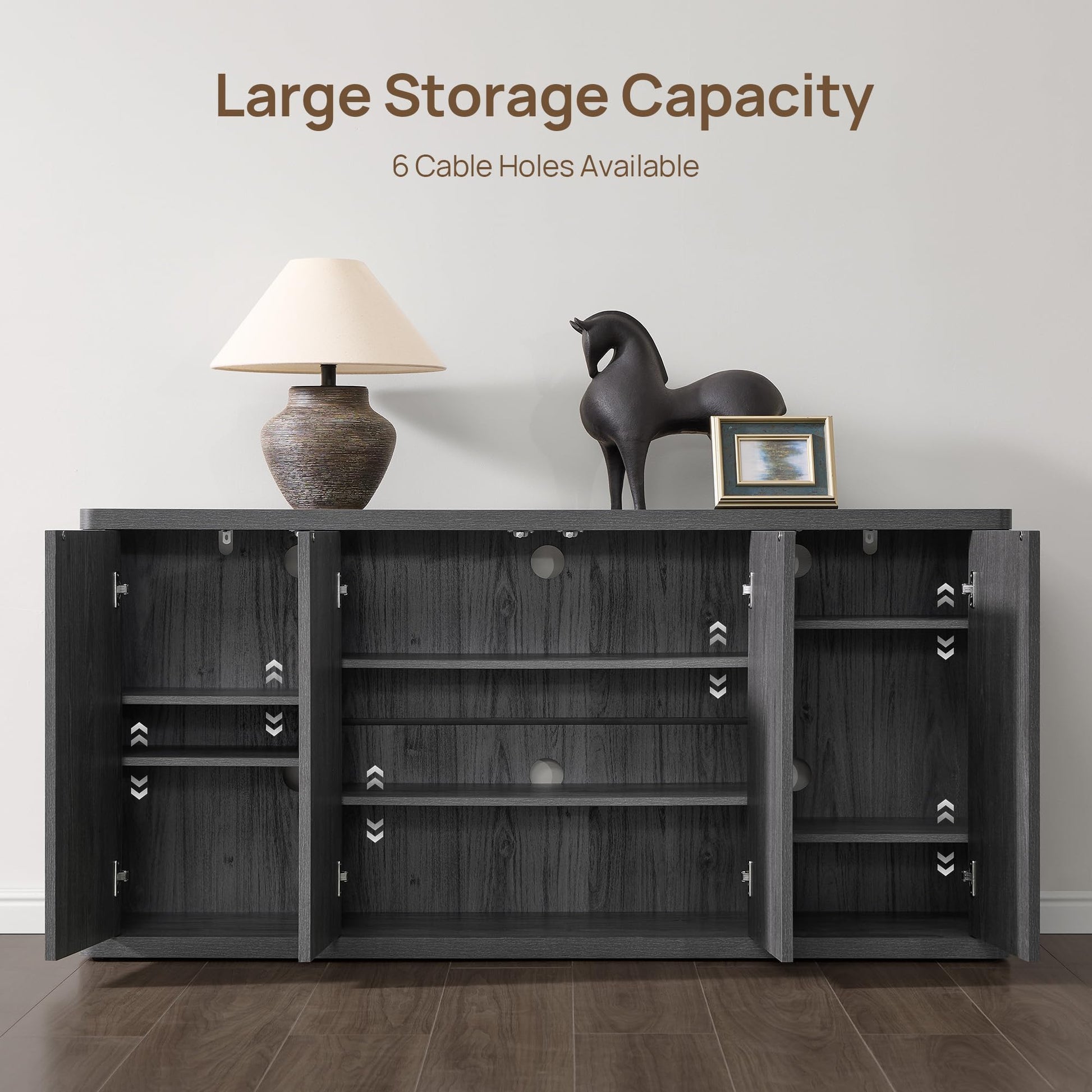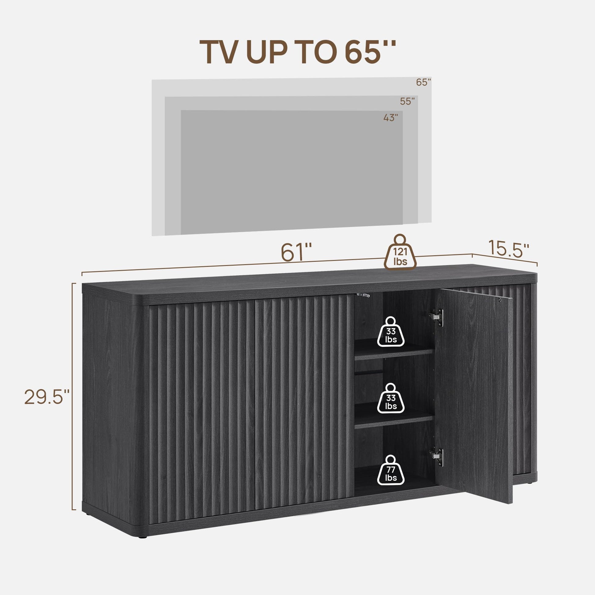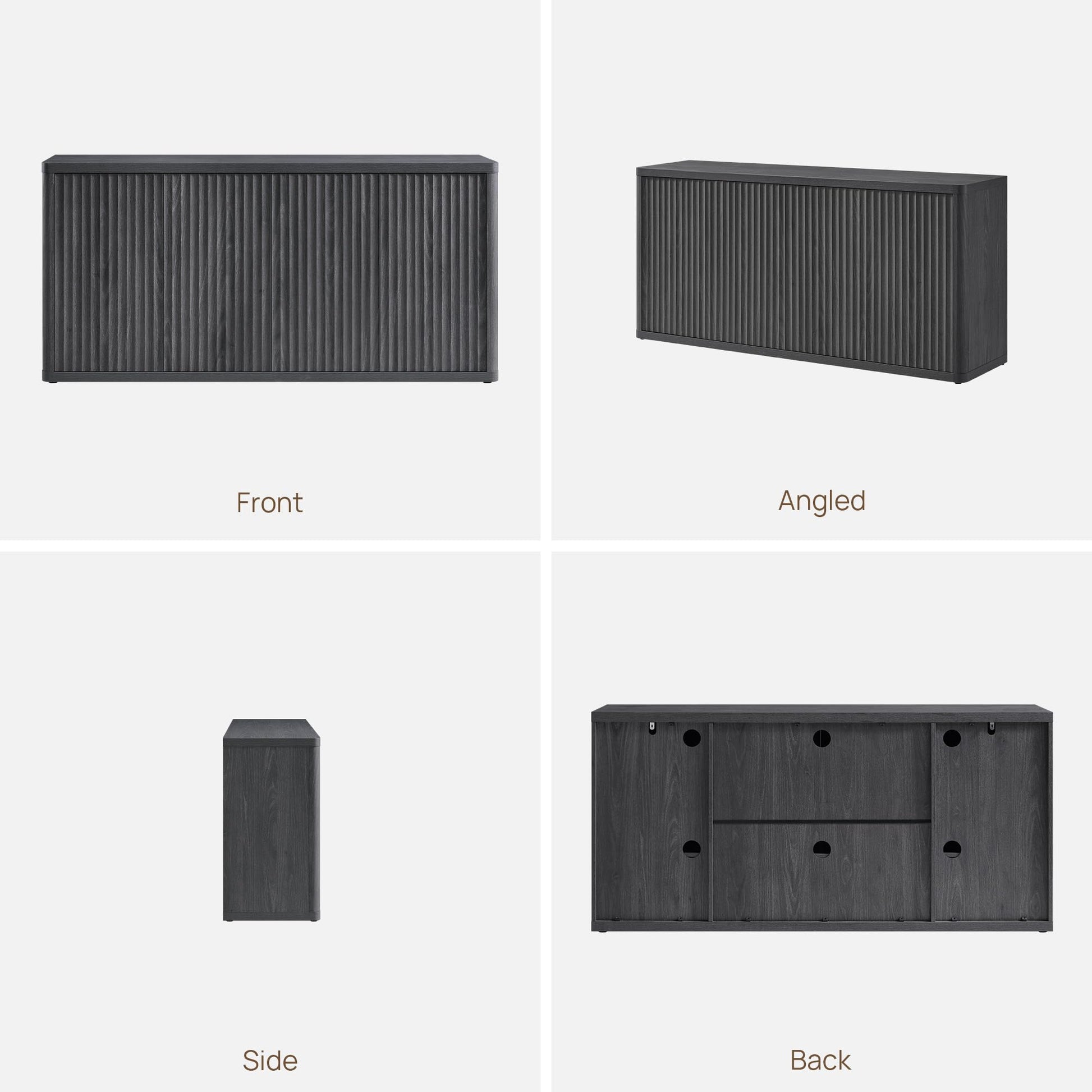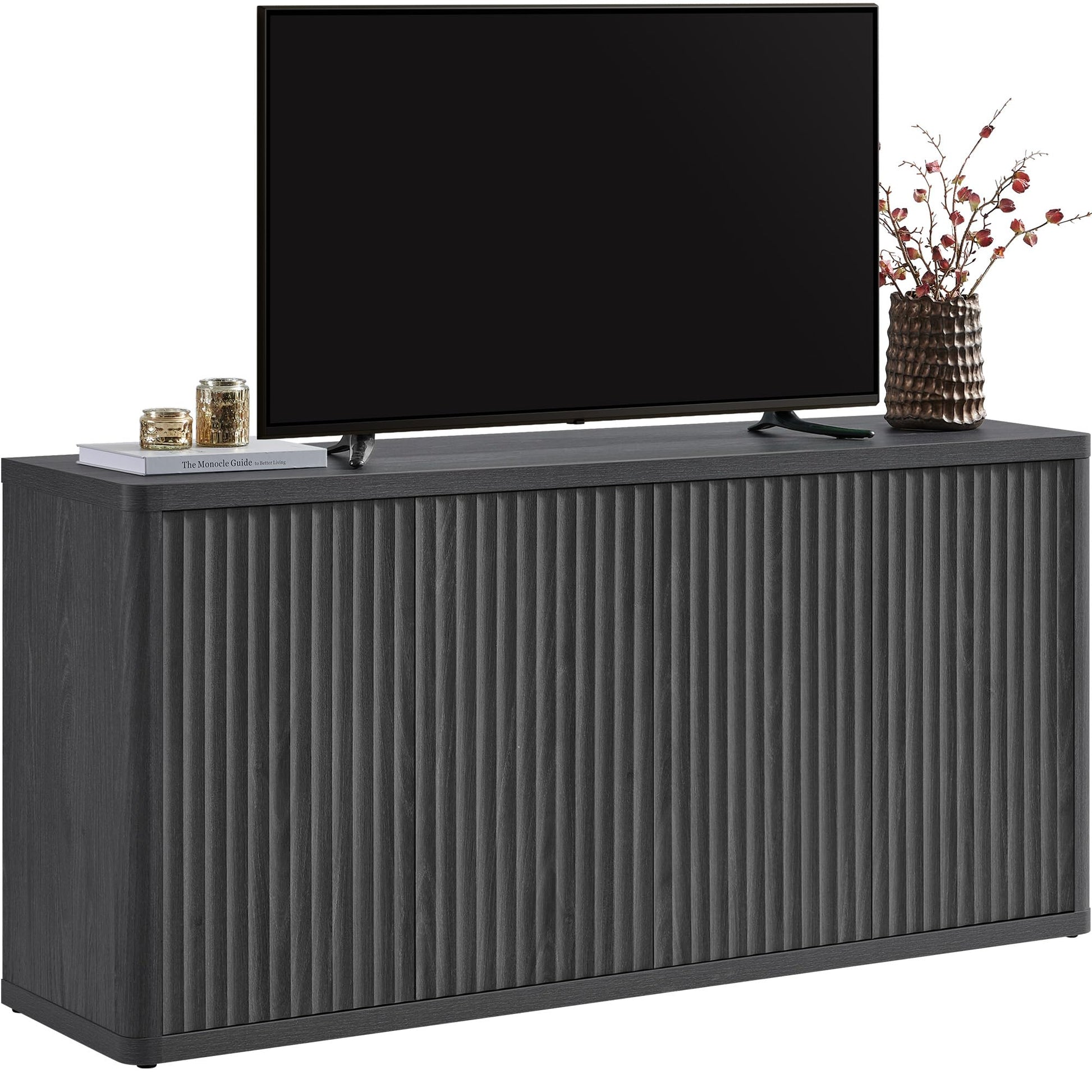 Elevate your living space with this sophisticated entertainment center designed to accommodate TVs up to 65 inches. The modern fluted console cabinet combines functional storage with contemporary aesthetics, featuring a distinctive dark grey alder finish that complements both modern and transitional interiors.