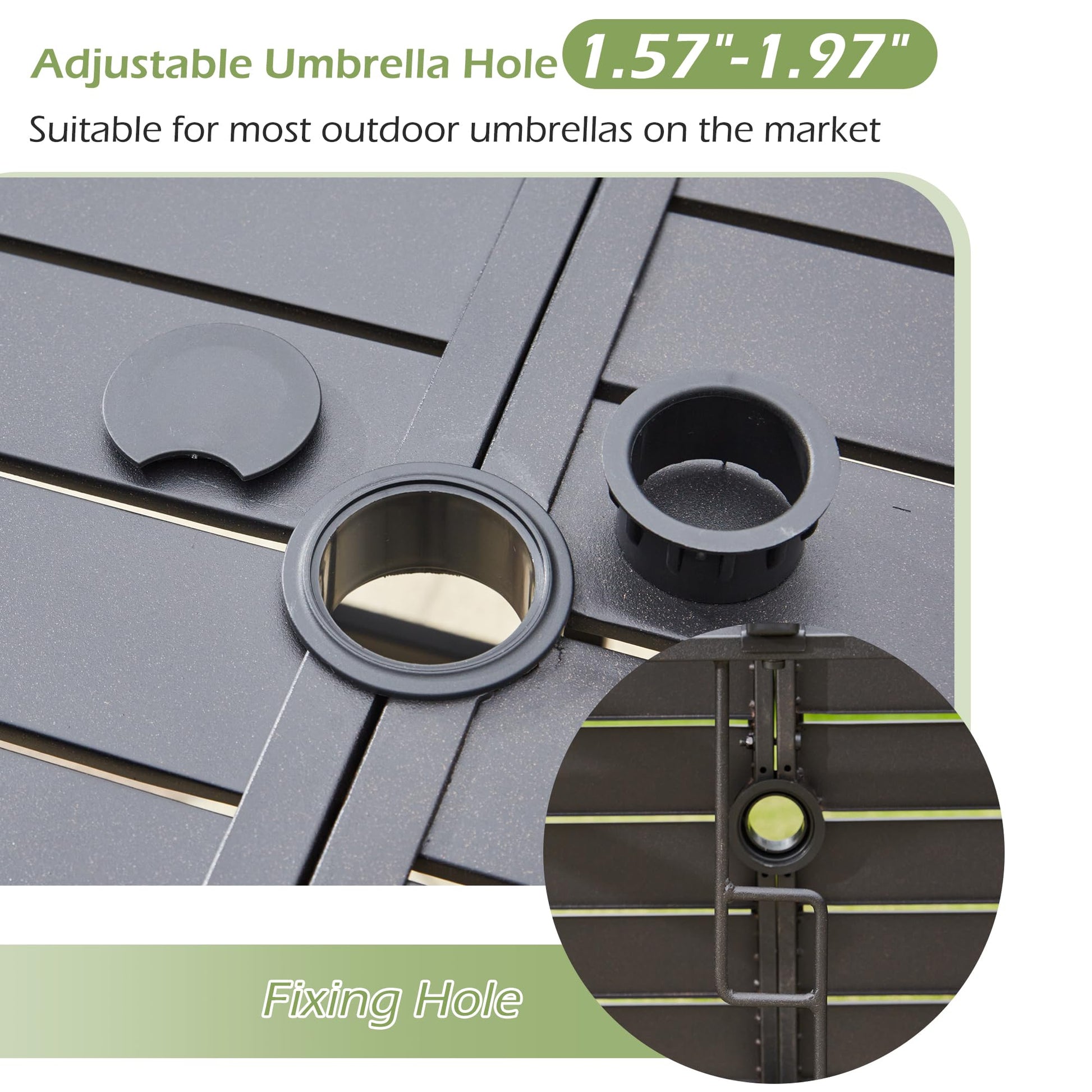 - Comes with 1.57"-1.97" Umbrella Hole:Say goodbye to umbrella hassles – our table features a versatile 1.57' to 1.97' adjustable hole that seamlessly accommodates every standard outdoor umbrella on the market, ensuring perfect shade solutions for your outdoor oasis