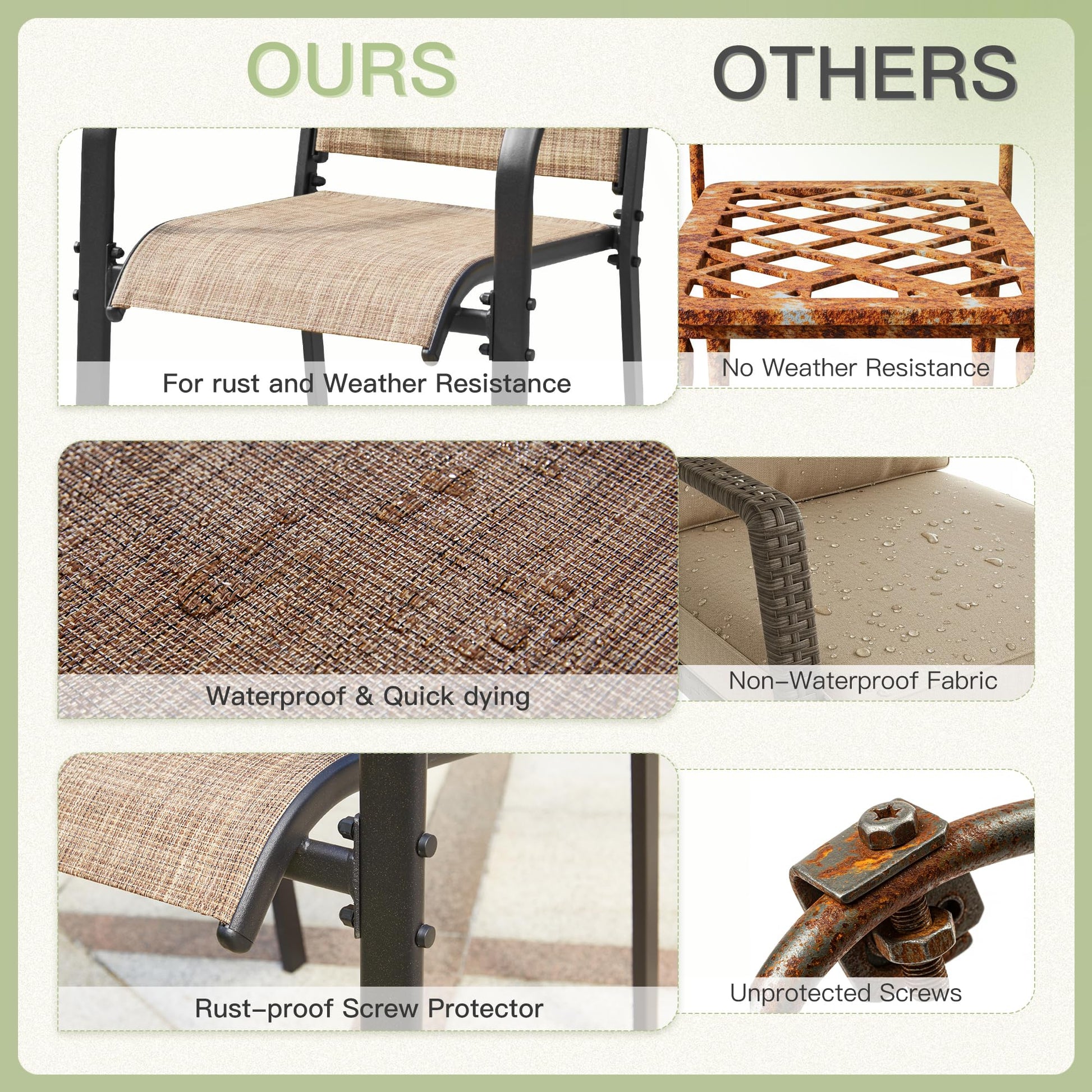 - Low-Maintenance Comfort for Effortless Living: Say goodbye to high-maintenance outdoor furniture! The breathable sling fabric on the chairs keeps you cool and comfortable, even on the hottest days. Cleaning is a breeze—just wipe with a cloth and water. Designed for both indoor and outdoor use, this patio set offers unmatched convenience without compromising on comfort or style