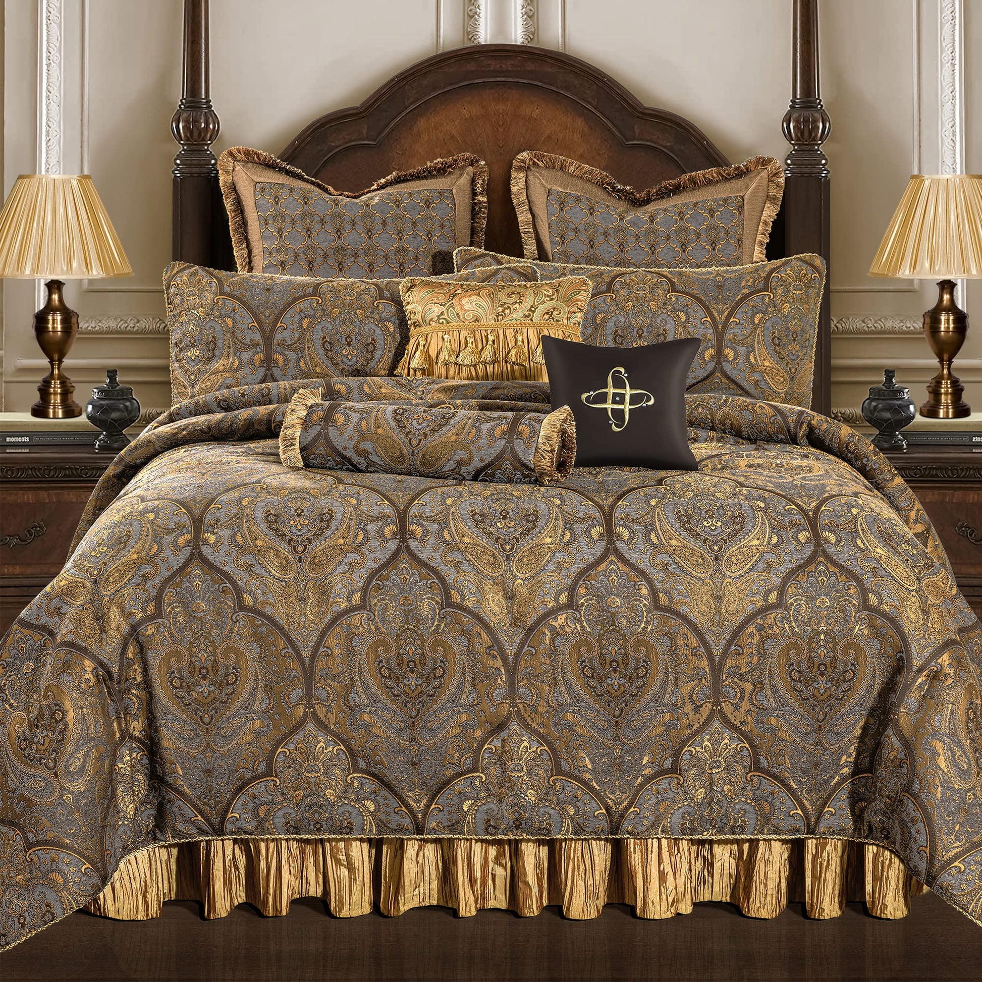 9-Piece Jacquard Comforter Set - Luxury Damask Bedding with Euro Shams & Bedskirt (Bronze Gold, Queen)