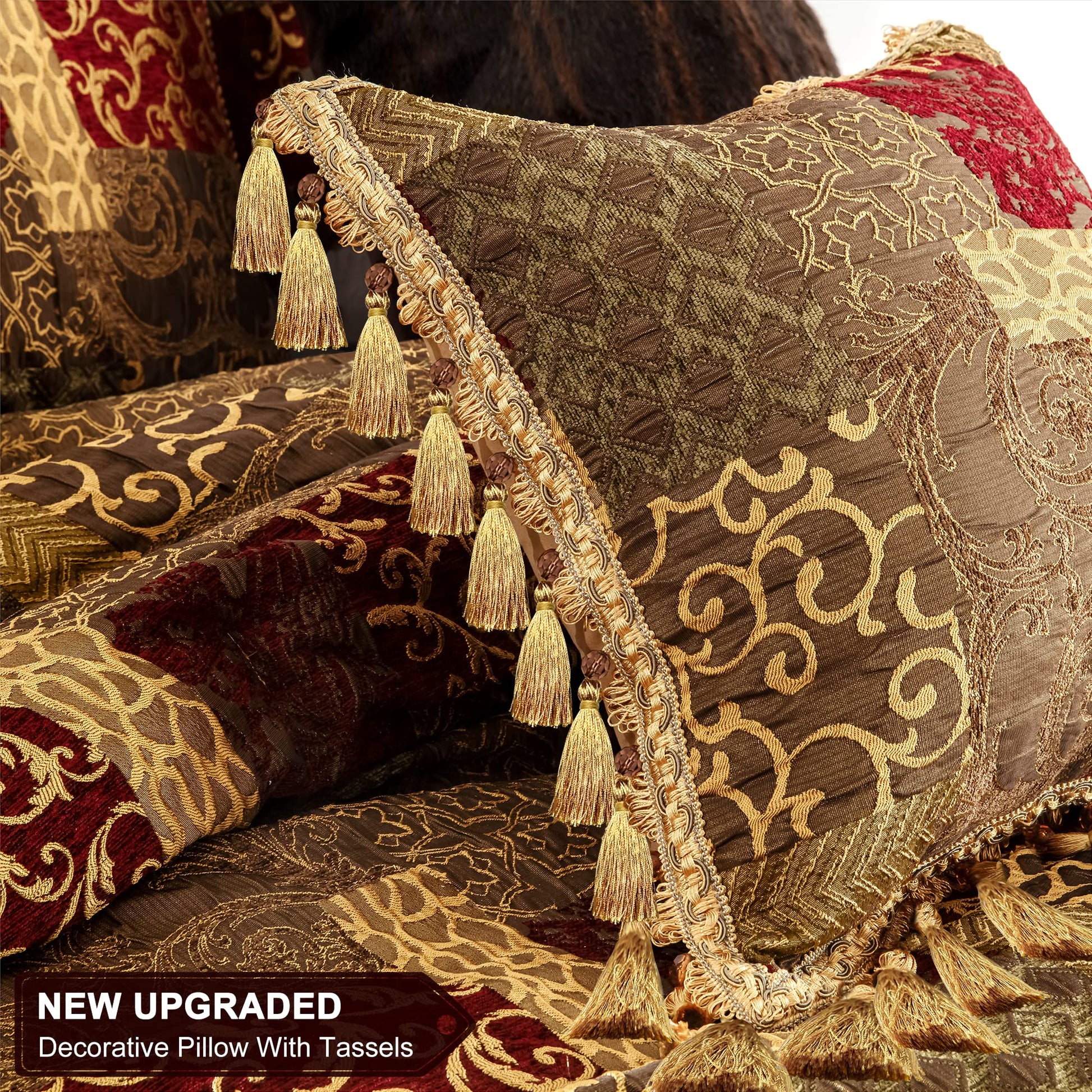 Transform your bedroom into a luxurious retreat with this exquisite 9-piece jacquard comforter set. Featuring intricate traditional patchwork design in rich red and gold tones, this ultra-soft bedding ensemble combines timeless elegance with exceptional comfort for a truly premium sleep experience.