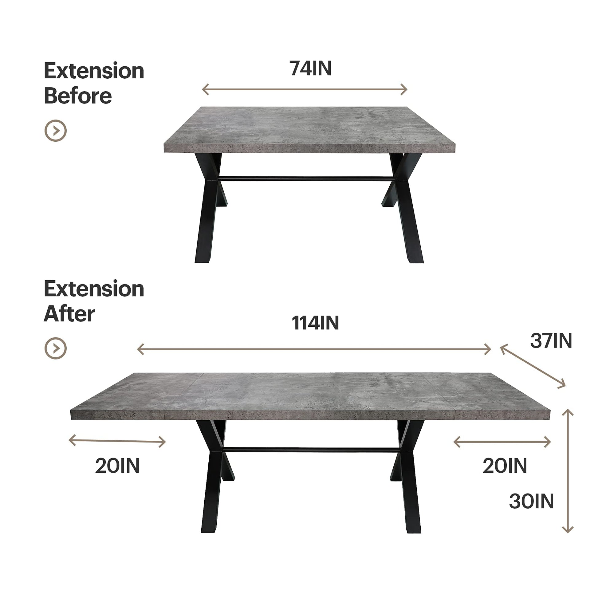 - TWO EXTENSION LEAVES-Before extension, The dining table measures 74.9''W x 37''D x 30''H. But the dining table extends by assembling separate extension leaves on both sides of the table, the length can reach 114'', which is seat for 8 people as dining or meeting comfortably.
